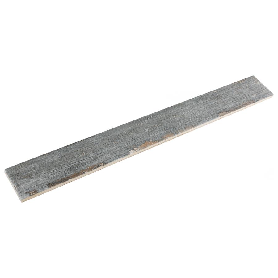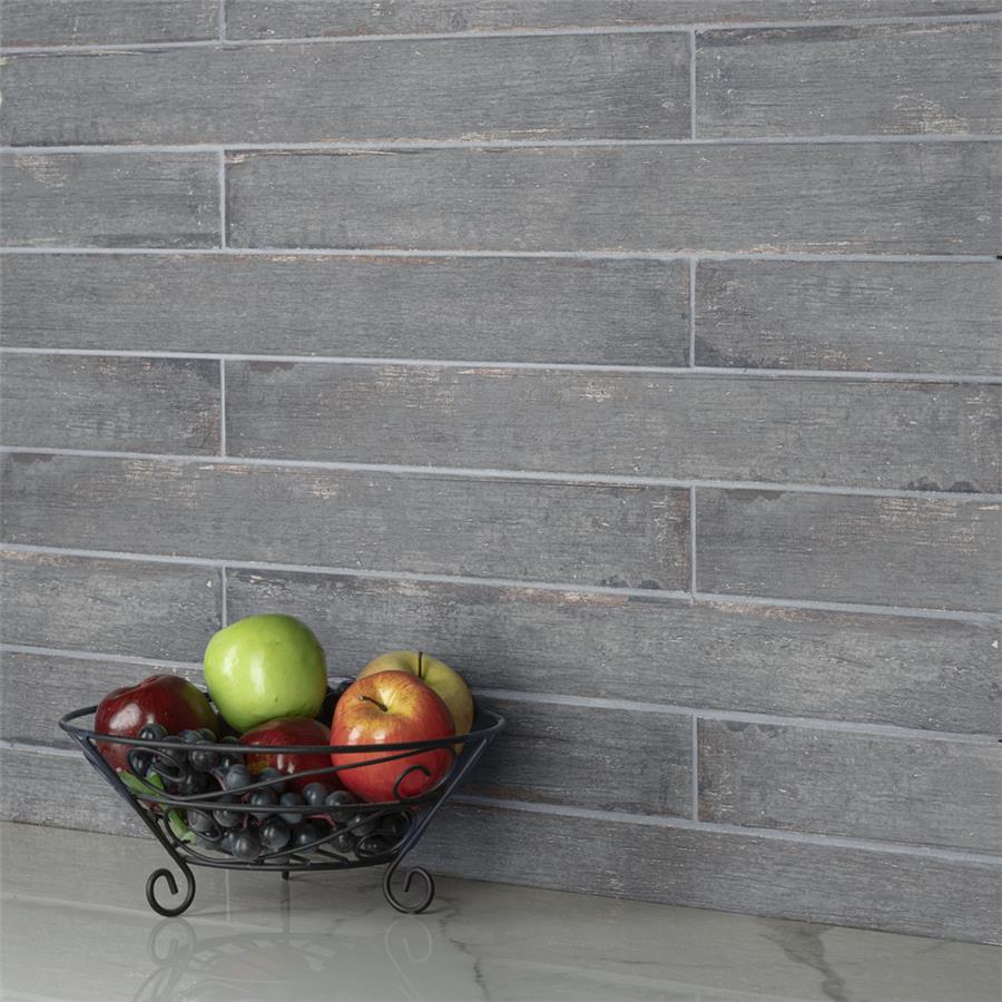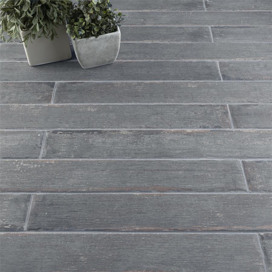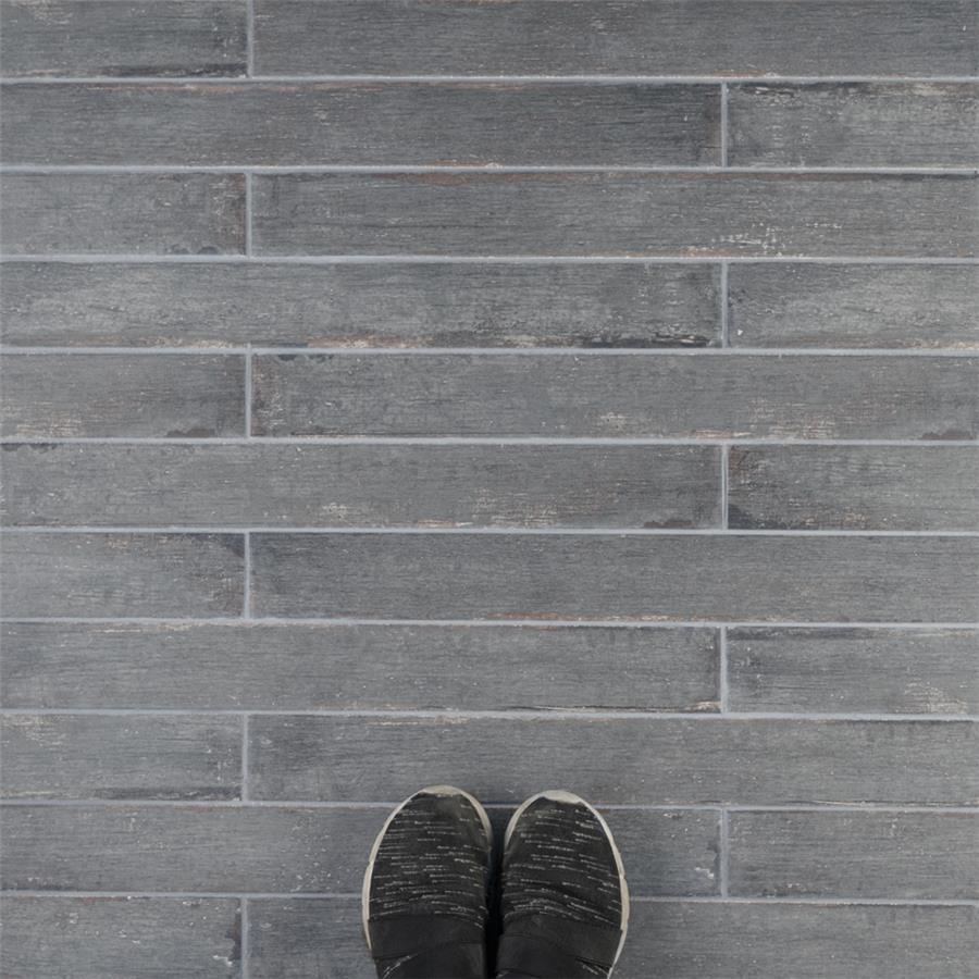 The Retro Cendra 2-3/4 in. x 23-1/2 in. Porcelain Floor and Wall Tile is a breathtaking addition to our collection of wood-look tiles. Crafted in Spain, the smoke grey glaze features a meticulously detailed grain accented in shades of ochre. To add further contrast and depth, this tile has subtle bumps and grooves that echo the texture of real wood. The finishing touch on this small plank is the imitations of scuffs and spots, which gives this tile an antiquated appearance reminiscent of distressed painted wood. This extruded porcelain tile has high variation for a one-of-a-kind look that can only be achieved through the partially handmade process. This tile offers endless design possibilities when paired with other products in the Retro series. This impervious, matte tile will look great in all indoor and outdoor locations, including walls, floors and patios.