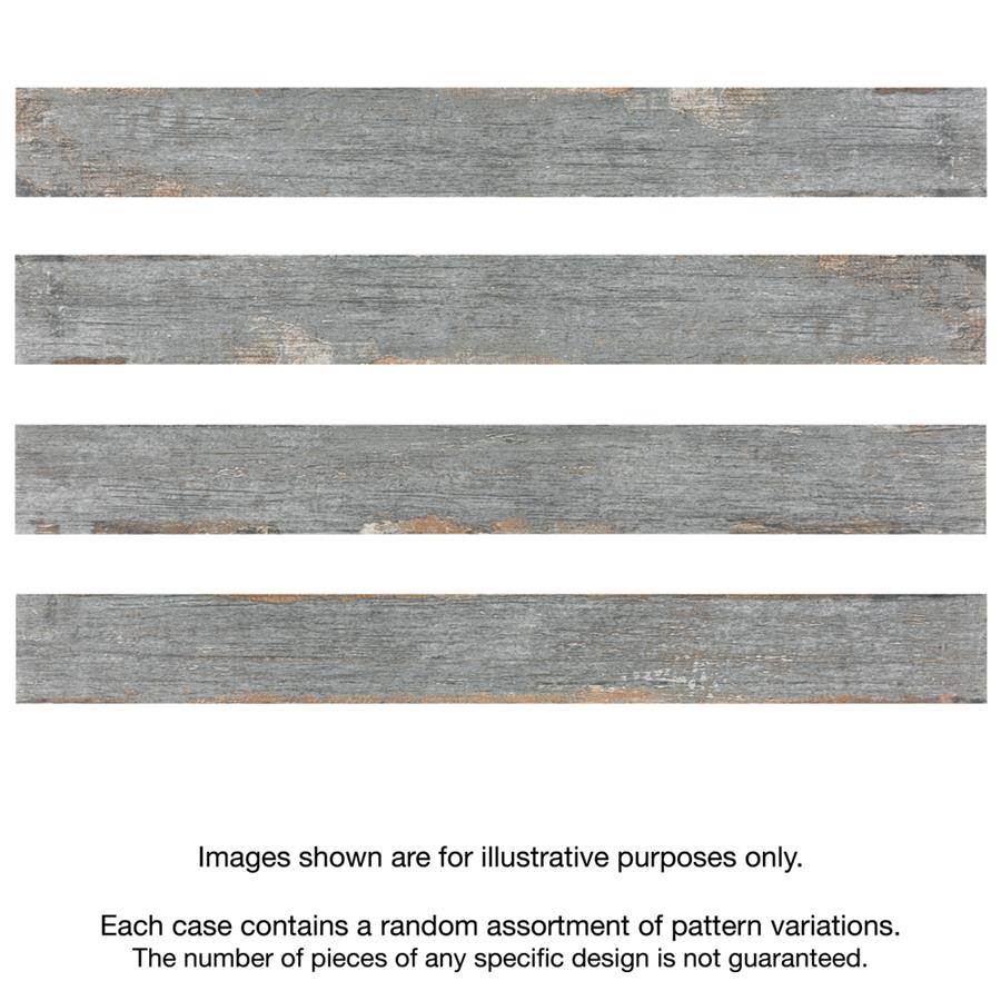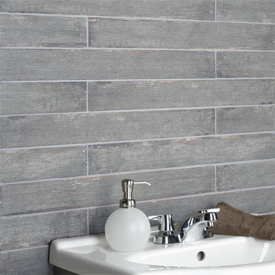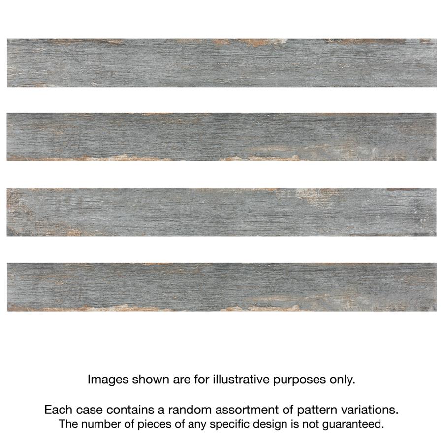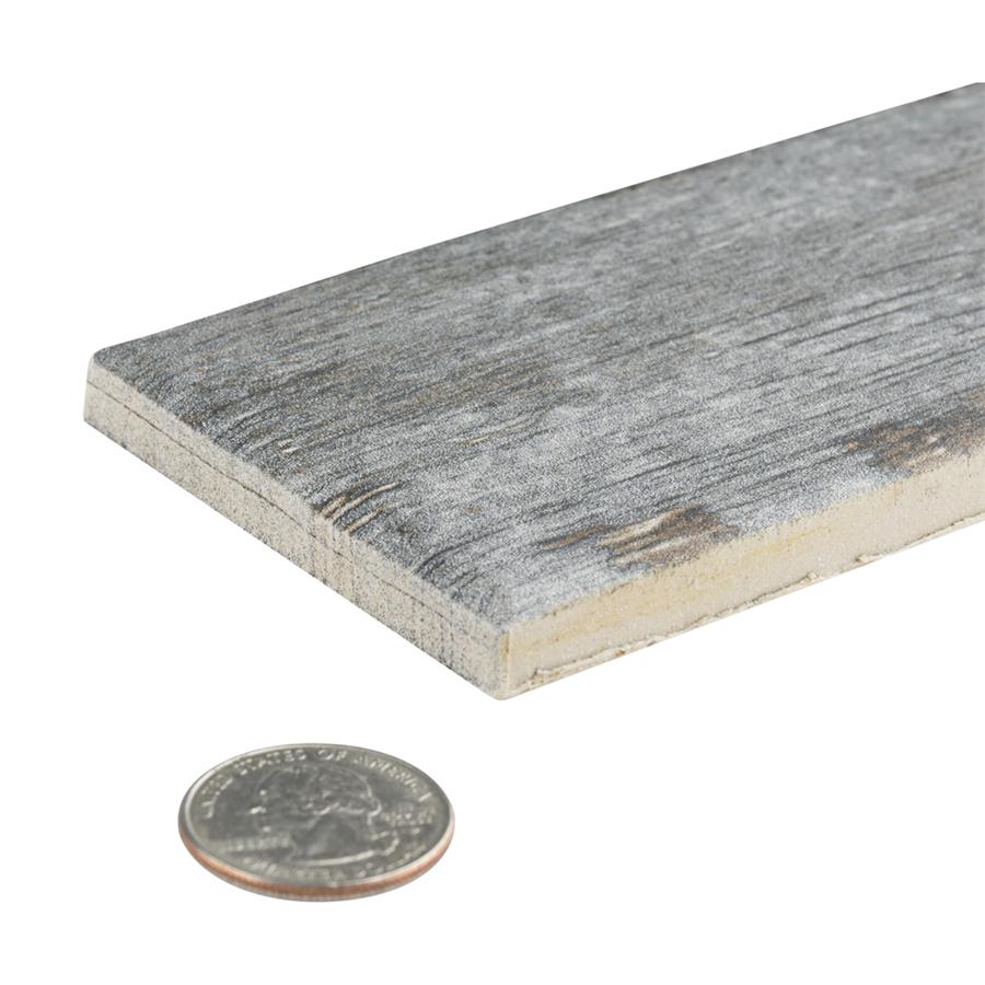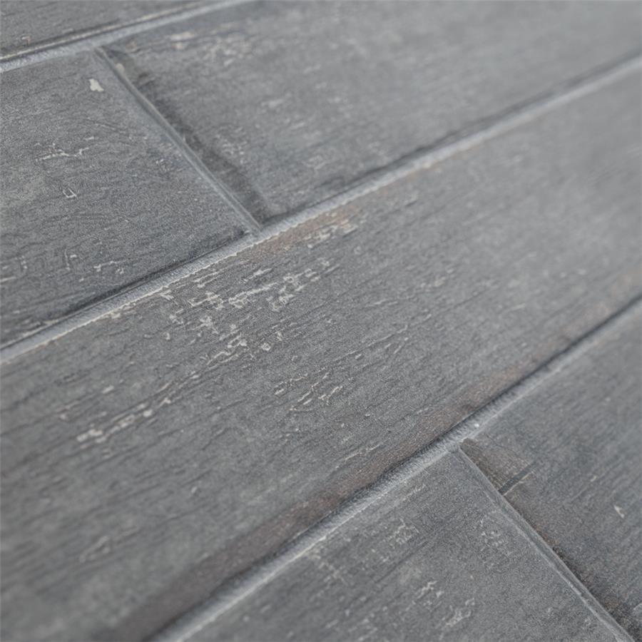 The Retro Cendra 2-3/4 in. x 23-1/2 in. Porcelain Floor and Wall Tile is a breathtaking addition to our collection of wood-look tiles. Crafted in Spain, the smoke grey glaze features a meticulously detailed grain accented in shades of ochre. To add further contrast and depth, this tile has subtle bumps and grooves that echo the texture of real wood. The finishing touch on this small plank is the imitations of scuffs and spots, which gives this tile an antiquated appearance reminiscent of distressed painted wood. This extruded porcelain tile has high variation for a one-of-a-kind look that can only be achieved through the partially handmade process. This tile offers endless design possibilities when paired with other products in the Retro series. This impervious, matte tile will look great in all indoor and outdoor locations, including walls, floors and patios.