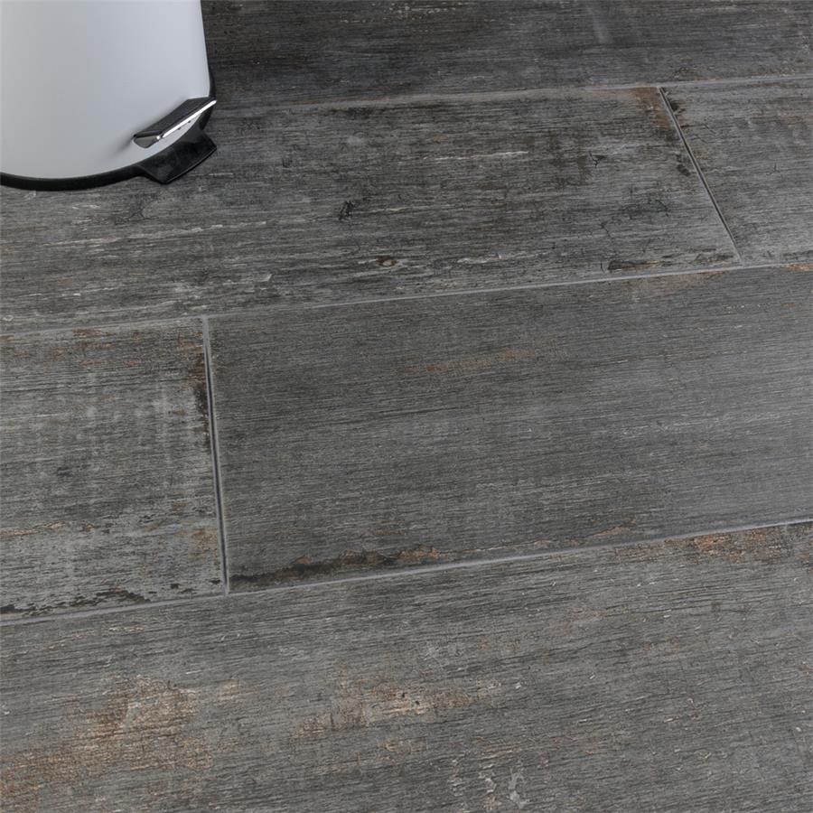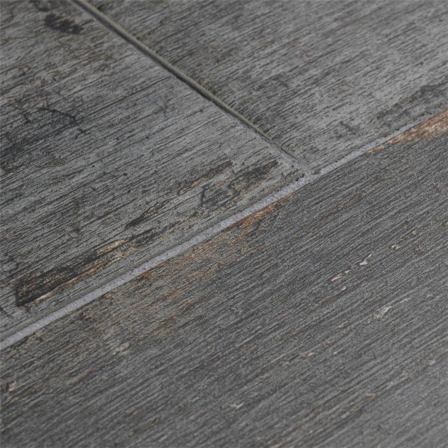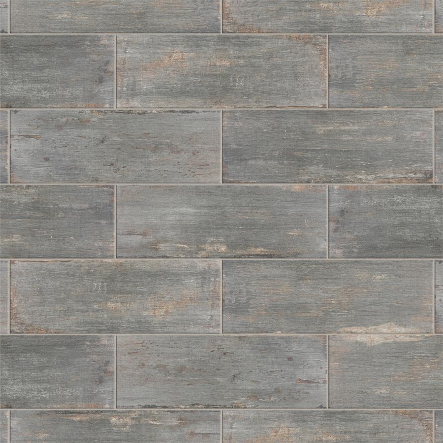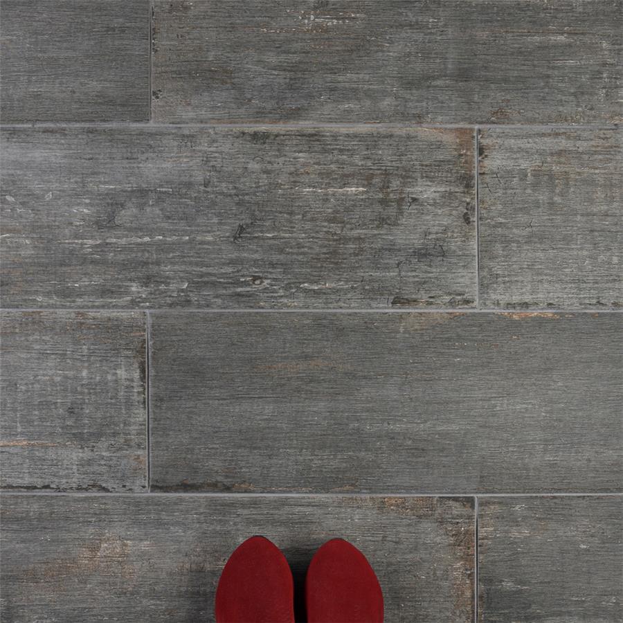 The Retro Cendra 8-1/4 in. x 23-1/2 in. Porcelain Floor and Wall Tile is a breathtaking addition to our collection of wood-look tiles. Crafted in Spain, the smoke grey glaze features a meticulously detailed grain accented in shades of ochre. To add further contrast and depth, this tile has subtle bumps and grooves that echo the texture of real wood. The finishing touch on this large plank is the imitations of scuffs and spots, which gives this tile an antiquated appearance reminiscent of distressed painted wood. This extruded porcelain tile has high variation for a one-of-a-kind look that can only be achieved through the partially handmade process. This tile offers endless design possibilities when paired with other products in the Retro series. This impervious, matte tile will look great in all indoor and outdoor locations, including walls, floors and patios.