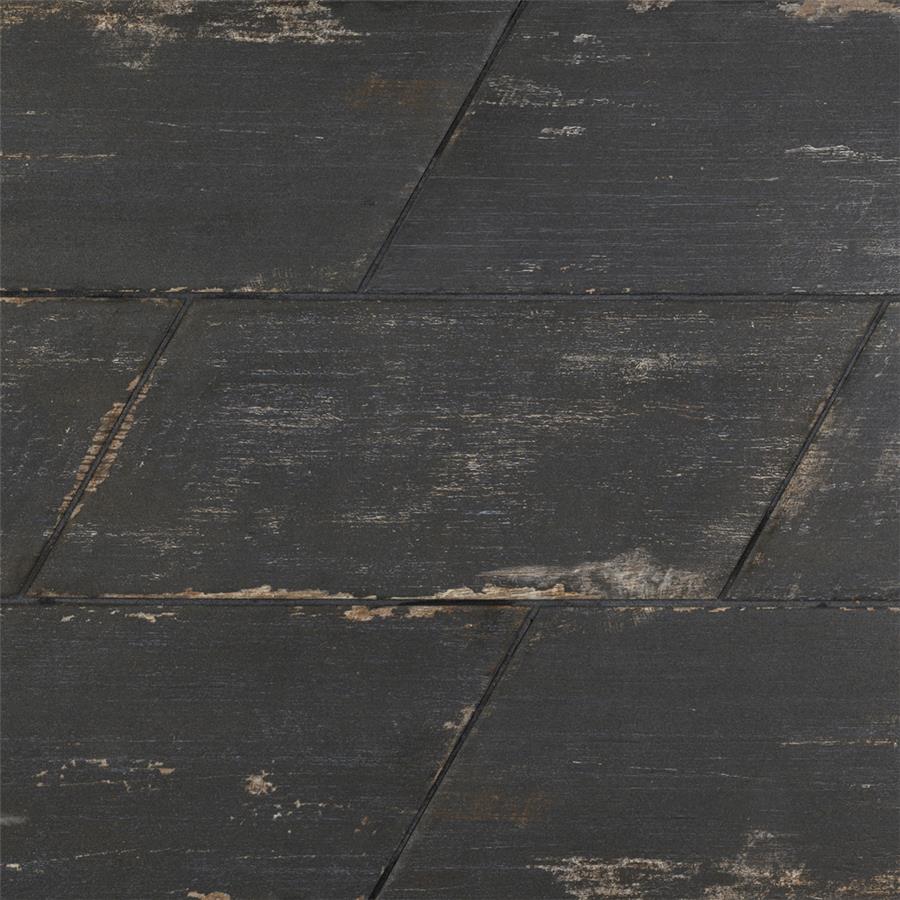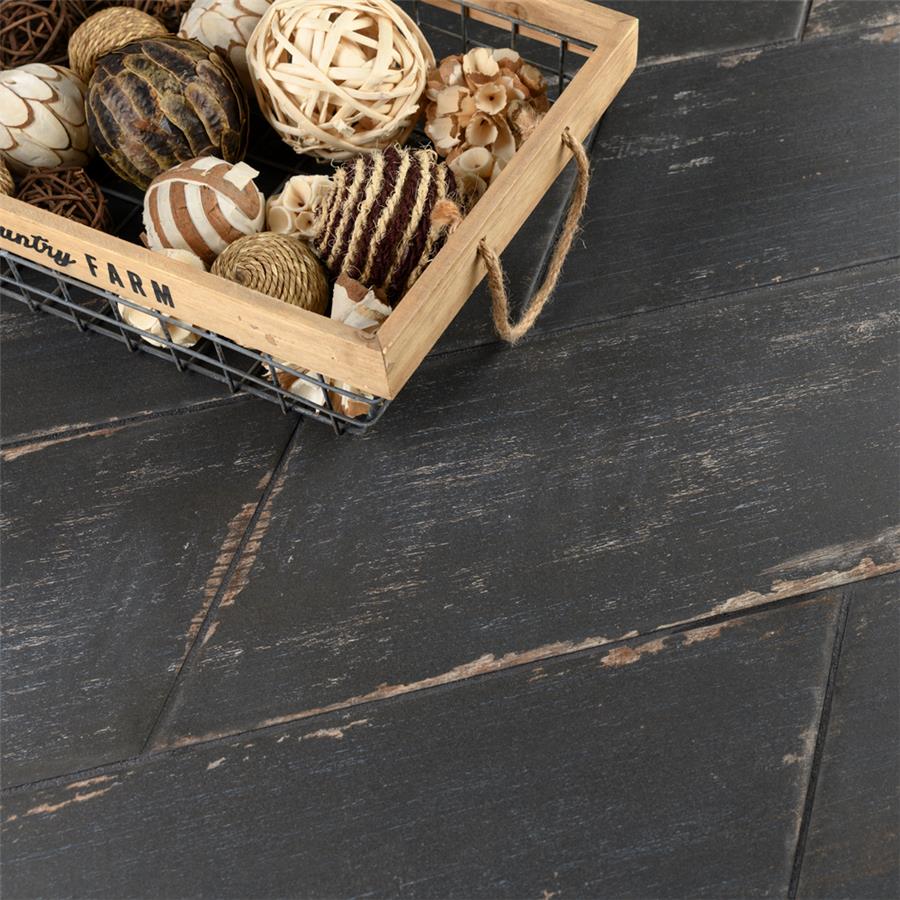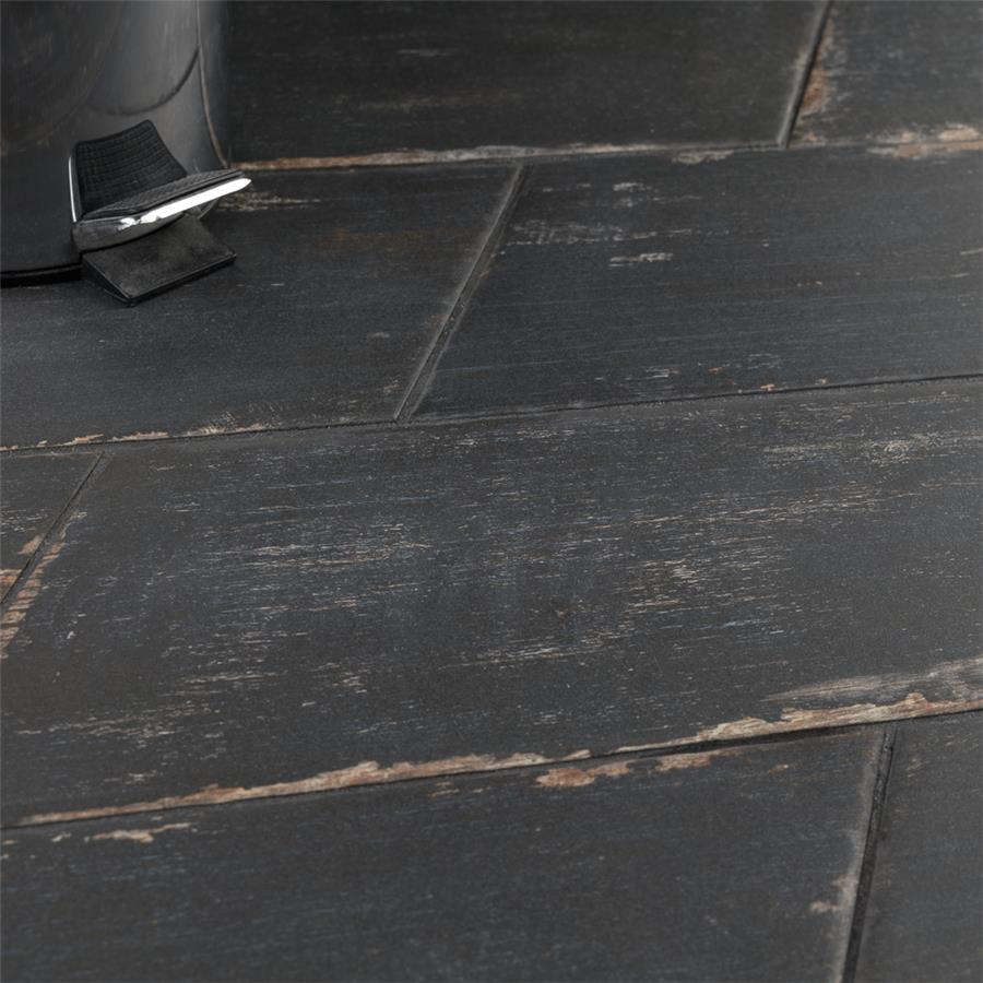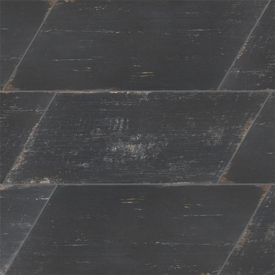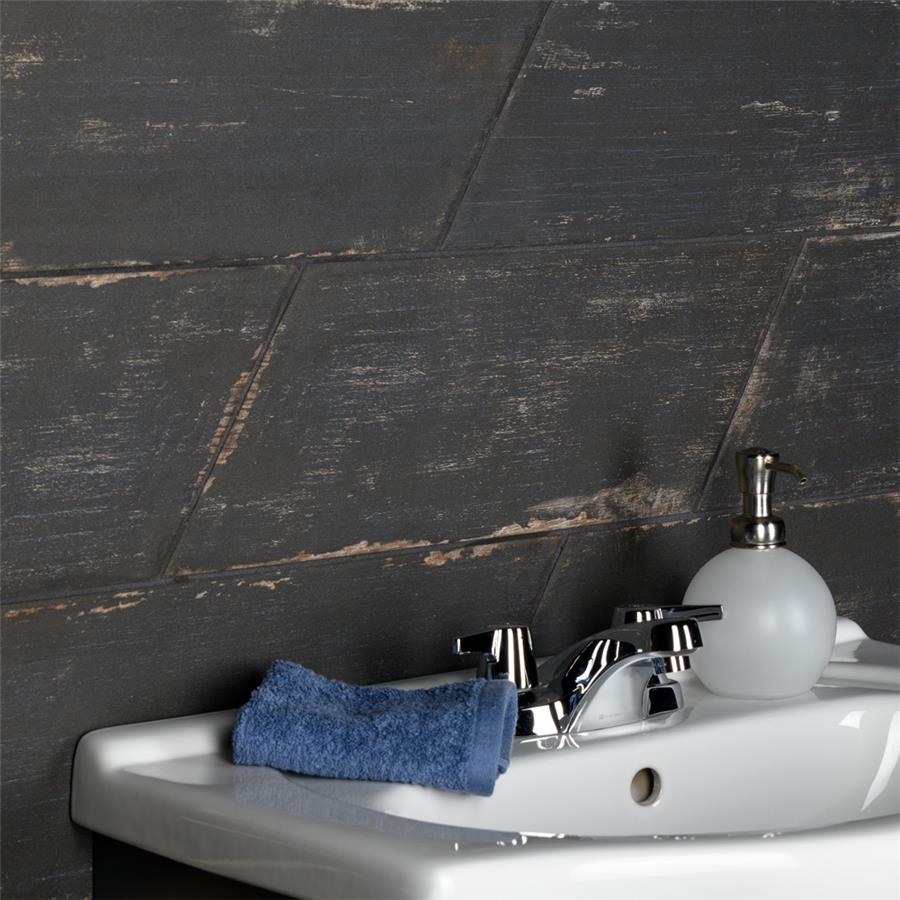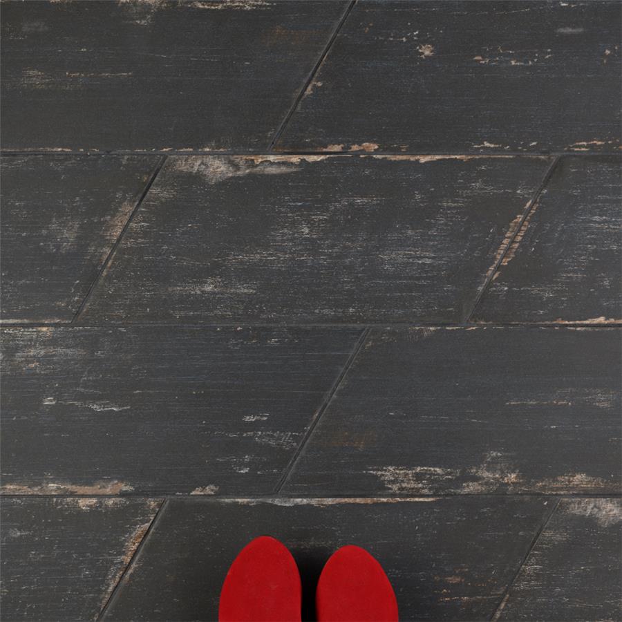 The Retro Naveta Nero 7-1/8 in. x 16-3/8 in. Porcelain Floor and Wall Tile is a breathtaking addition to our collection of wood-look tiles. Crafted in Spain, the soot black glaze features a meticulously detailed grain accented in shades of tan. To add further contrast and depth, this tile has subtle bumps and grooves that echo the texture of real wood. The finishing touch on this large plank is the imitations of scuffs and spots, which gives this tile an antiquated appearance reminiscent of distressed painted wood. This extruded porcelain tile has high variation for a one-of-a-kind look that can only be achieved through the partially handmade process. This tile offers endless design and layout possibilities when paired with other products in the Retro series. This impervious, matte tile will look great in all indoor and outdoor locations, including walls, floors and patios.