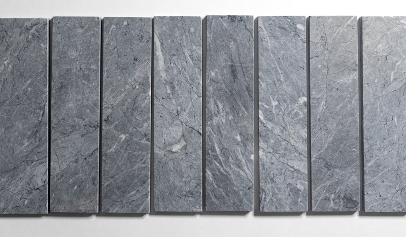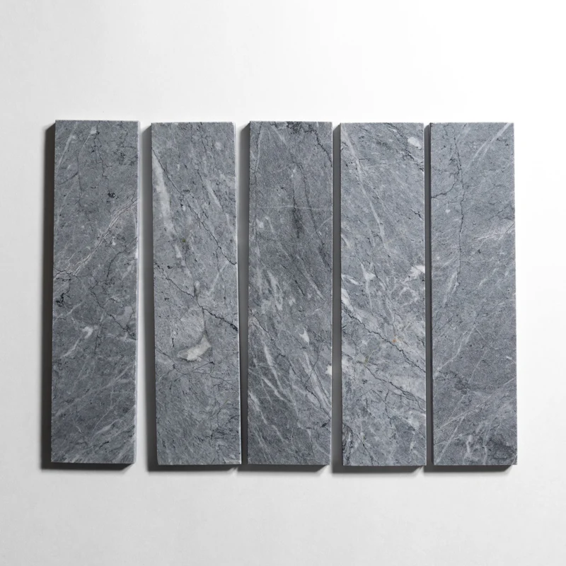 Riviera Gray is a marble that needs nothing else to create a statement piece. The blue-gray background has striking white veins with occasional red threads. Tiles will have epoxy backing.
