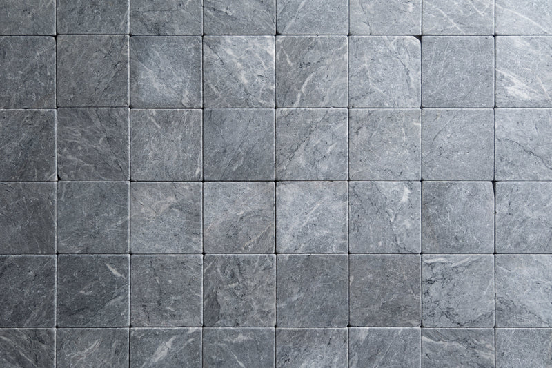 Riviera Gray is a marble that needs nothing else to create a statement piece. The blue-gray background has striking white veins with occasional red threads. Tiles will have epoxy backing.
