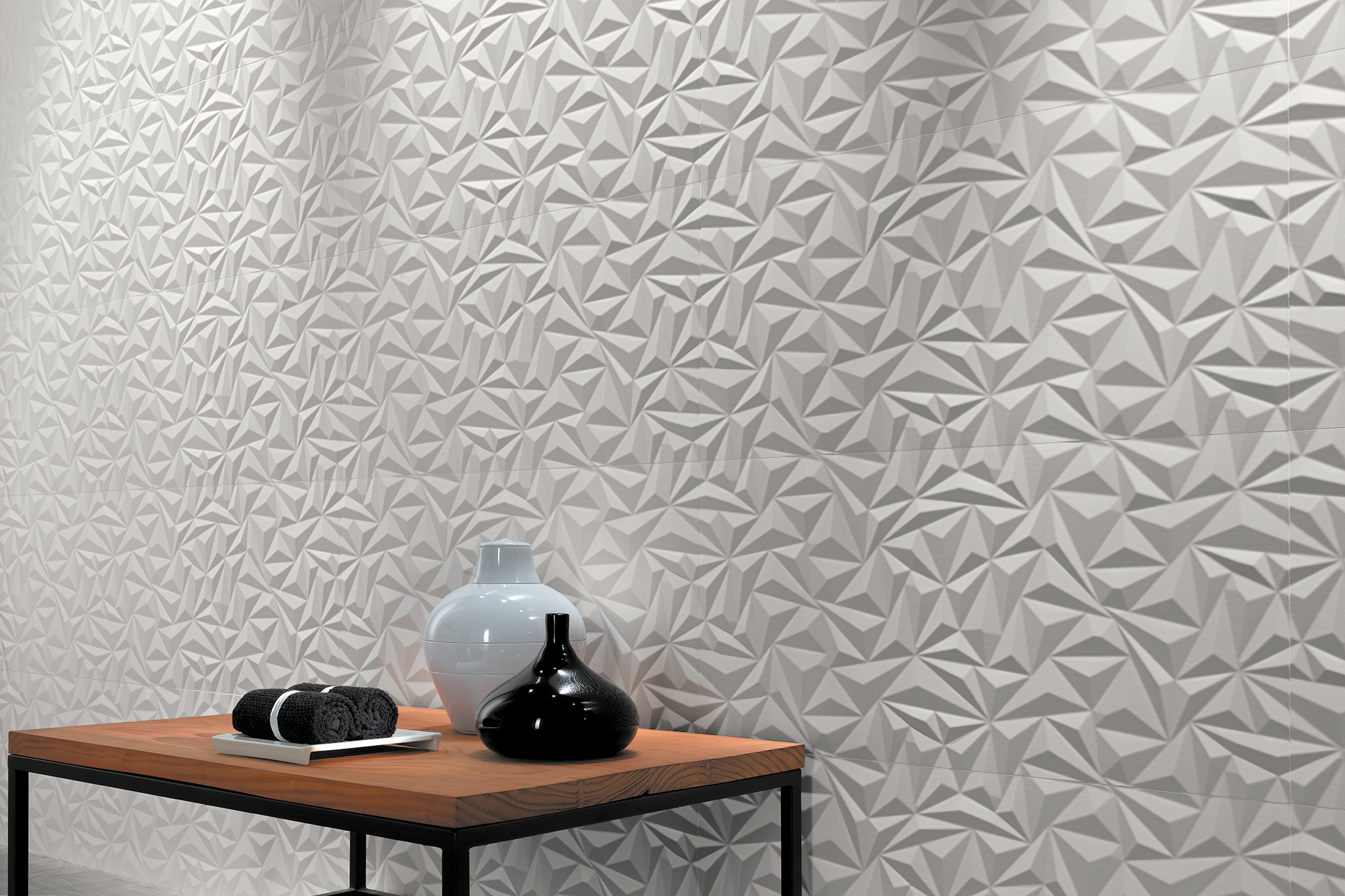 The Shape Collection rides the trend of structured wall tile. The 16″x32″ size of this Italian ceramic wall tile creates drama without being overwhelming. The abstract and sinuous patterns of Angle and Mesh are enlivened and enhanced by natural or artificial lighting. To complement the textured options, we offer a flat 16″x32″ tile – mix and match the 3D and flat options to create amazing wallscapes. Finish the edges of the tile with the 0.38″x8″ trim piece.