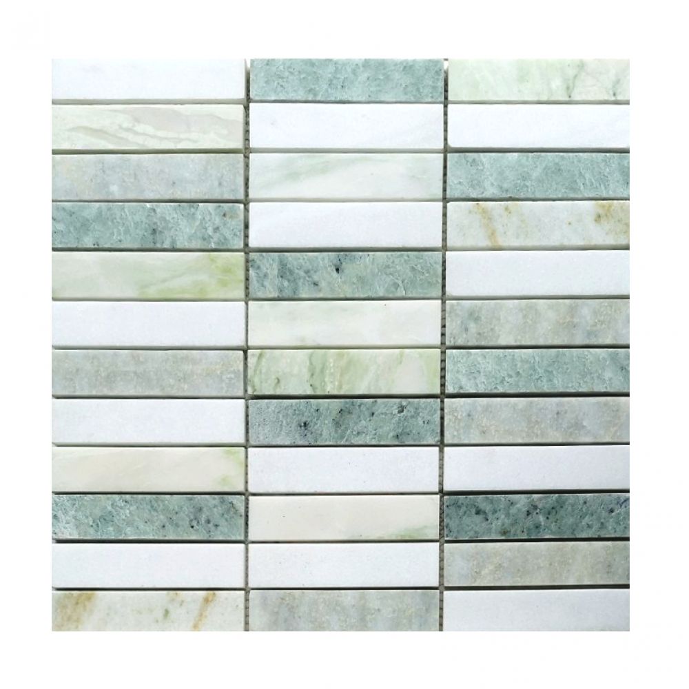 Product Sold By The SheetSlot Blue 11.75×11.75 – Green Onyx and Thassos marble blended into a stacked linear pattern.Suggested Grout Color: Bostik Trucolor White H152WARNING: This product can expose you to chemicals including crystalline silica (airborne particles of respirable size) in dust created during fabrication/installation if the product is dry cut/ground or pulverized, which are known to the State of California to cause cancer. For more information, go to https://www.p65warnings.ca.gov/.
