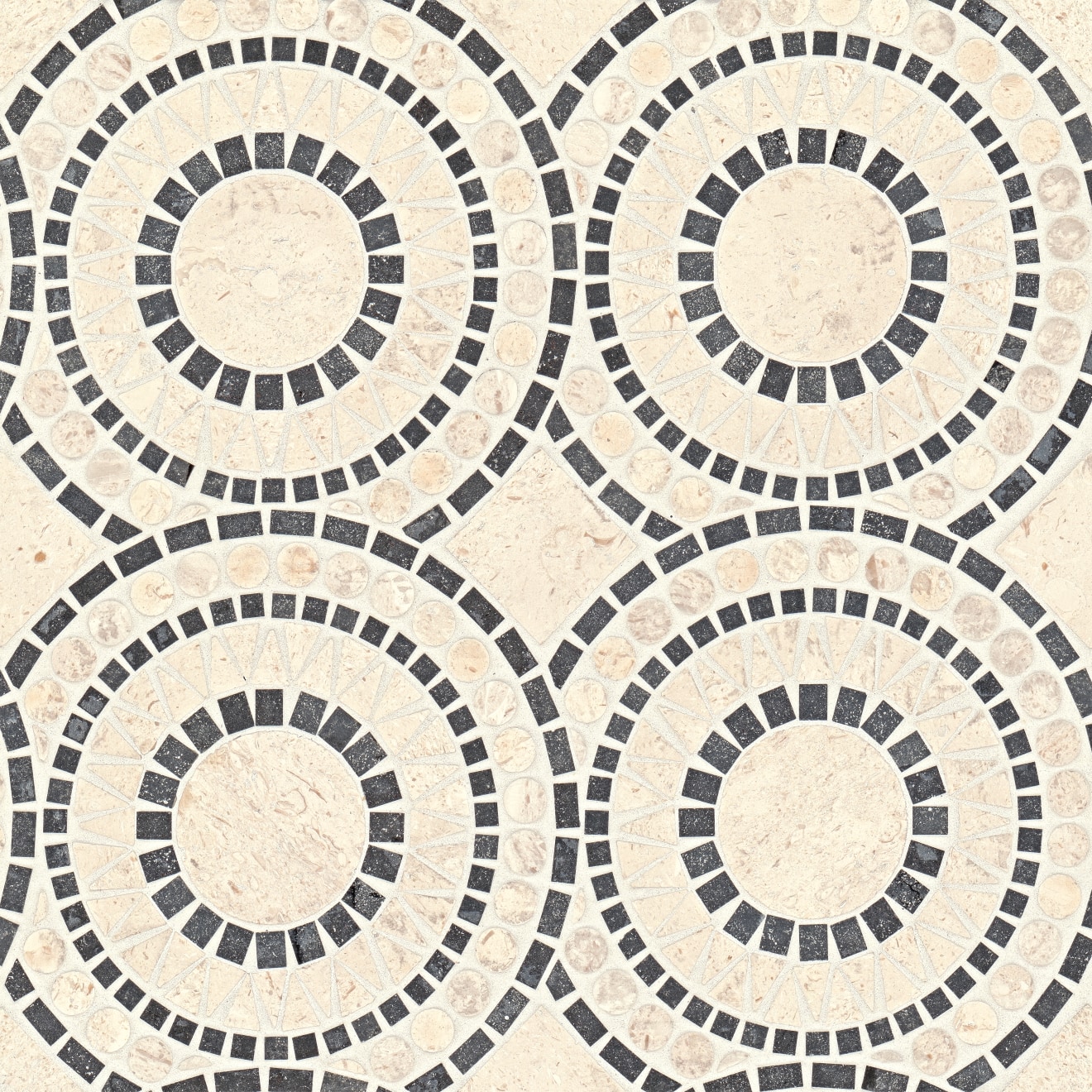 If you’re looking for a stone mosaic with natural energy, fix your gaze upon the Solis Collection. Inspired by the sun, the stone blend Solis radiates style from its eye-catching circular center to its intricate rings of delicate geometric shapes. Available in four monochromatic palettes suitable for any space, the Solis Collection will make a sun worshipper out of anyone.Images and product samples are representative of a product’s potential characteristics. There is no guarantee that the sample product or images will 100% match the product received. Natural stone tiles/slabs and corresponding trim may not be an exact match. We reserve the right to make changes to product specifications at any time without notice. Natural stone is a product of nature and subject to variations in color, shade, grain, sizing, veining, movement, pitting, surface texture and finish. No two stone tiles/slabs are exactly the same. Some slabs require filler during production, which is a necessary and acceptable practice in the stone industry. Prior to installation, installer must blend stone tiles from several different boxes to achieve an even distribution of color range. Installer must conduct a dry mock layout under proper lighting conditions prior to installation. It is the consumer’s responsibility to inspect the product prior to installation to ensure satisfaction with all characteristics. Once installed, the product is deemed accepted. Consumer is responsible for ensuring proper installation, application, and use. Aerosol catalyst adhesives should not be used for stone installations as they may cause discoloration. Due to porosity, all natural stone products must be sealed prior to installation. Regular care and maintenance is required for natural stone products. Do not use vinegar or any cleaners containing acids or strong alkalis on natural stone. Reference the most current TCNA Handbook, ANSI, the MIA, manufacturer’s specifications, and the Bedrosians® Care & Maintenance guide for installation, outdoor use, care and maintenance information. Natural stone products installed in uncovered outdoor installations may experience modifications to the color and finish due to UV and water exposure. Natural stone products are not warranted.