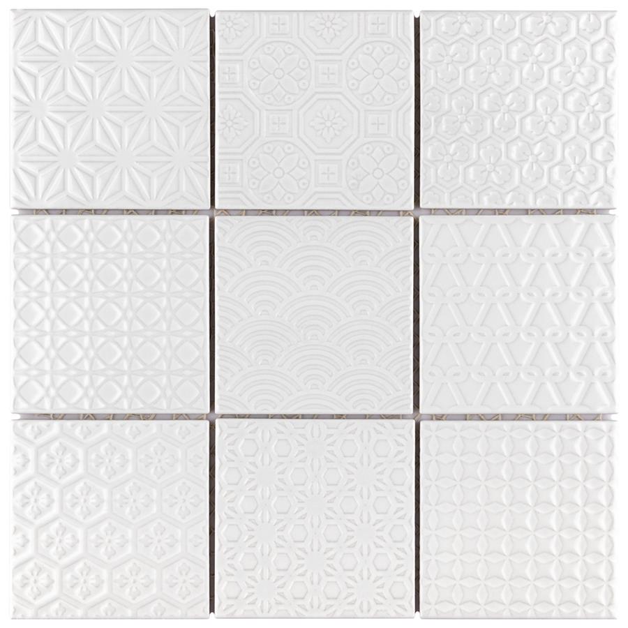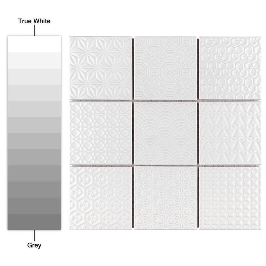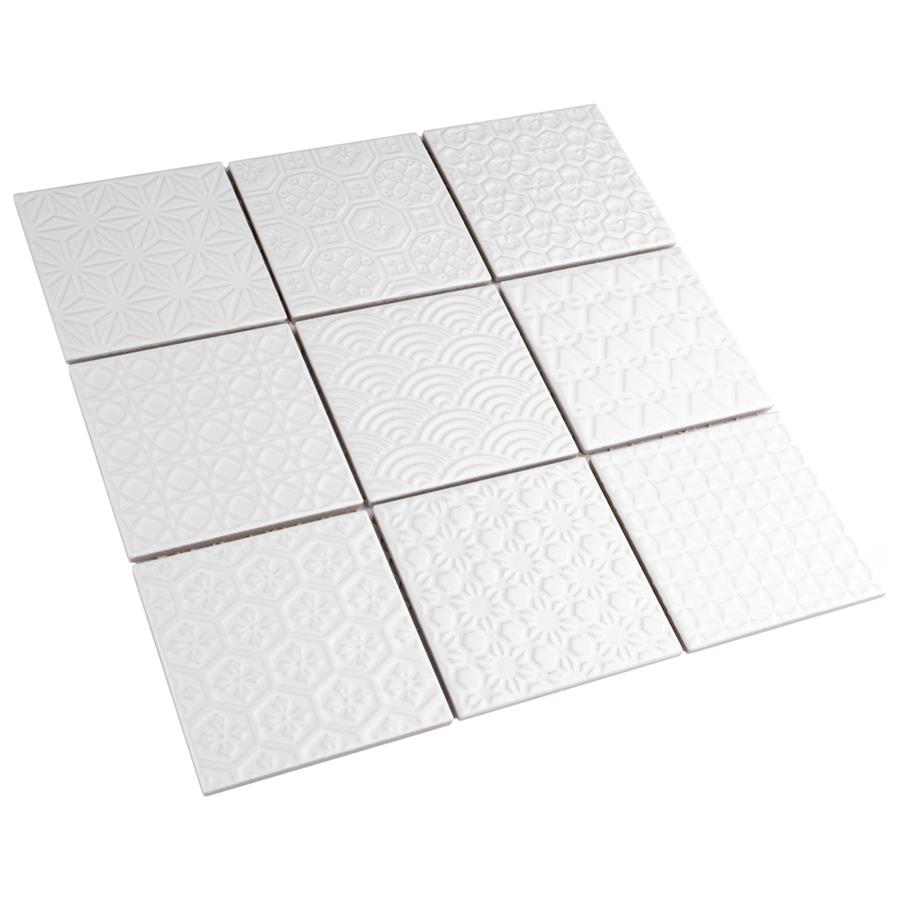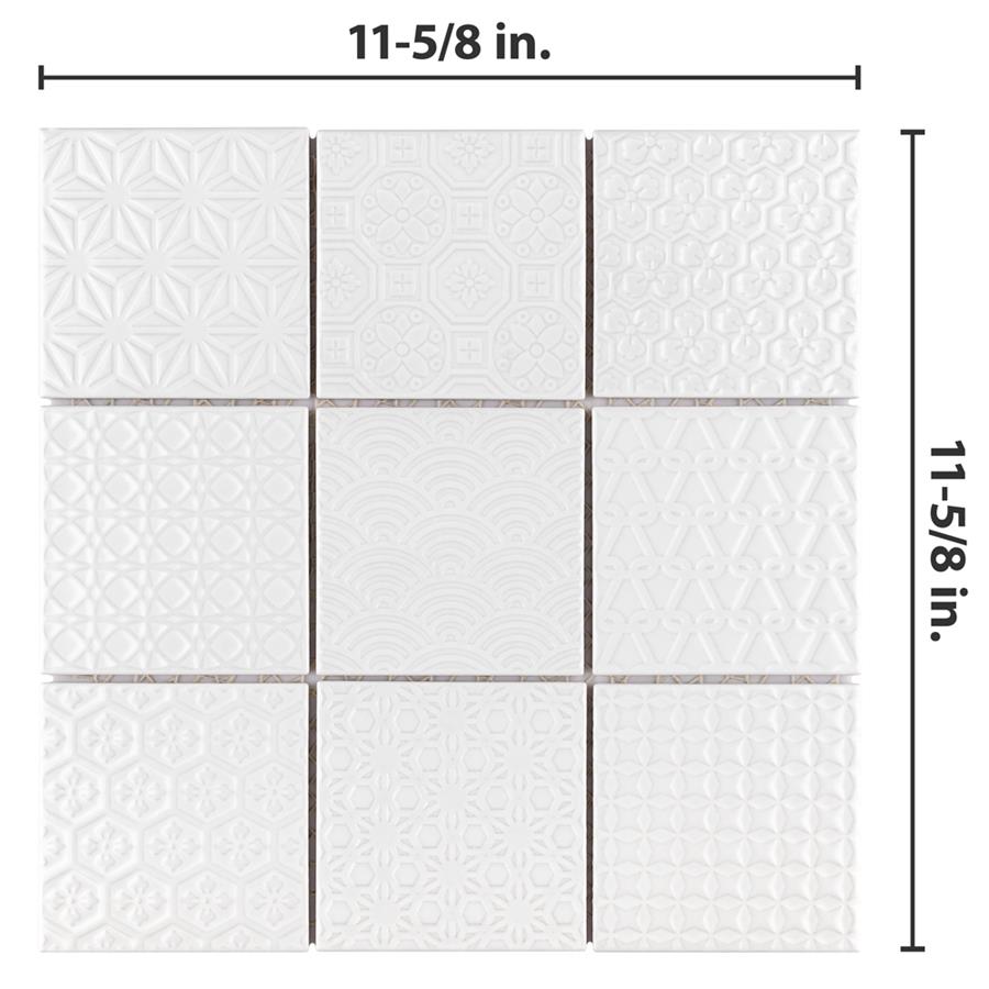 The SomerTile Spirit White 11-5/8 in. x 11-5/8 in. x 6 mm Porcelain Mosaic Tile blends together rustic elements and a contemporary feel. Each patchwork mosaic features nine tiles with a different design that varies throughout each sheet. These white tiles have raised patterns, giving a multi-dimensional look to any room. The strong mesh backing material makes for easy installation and the durable porcelain material and impervious water absorption rating make this mosaic a great choice for indoor and outdoor applications.