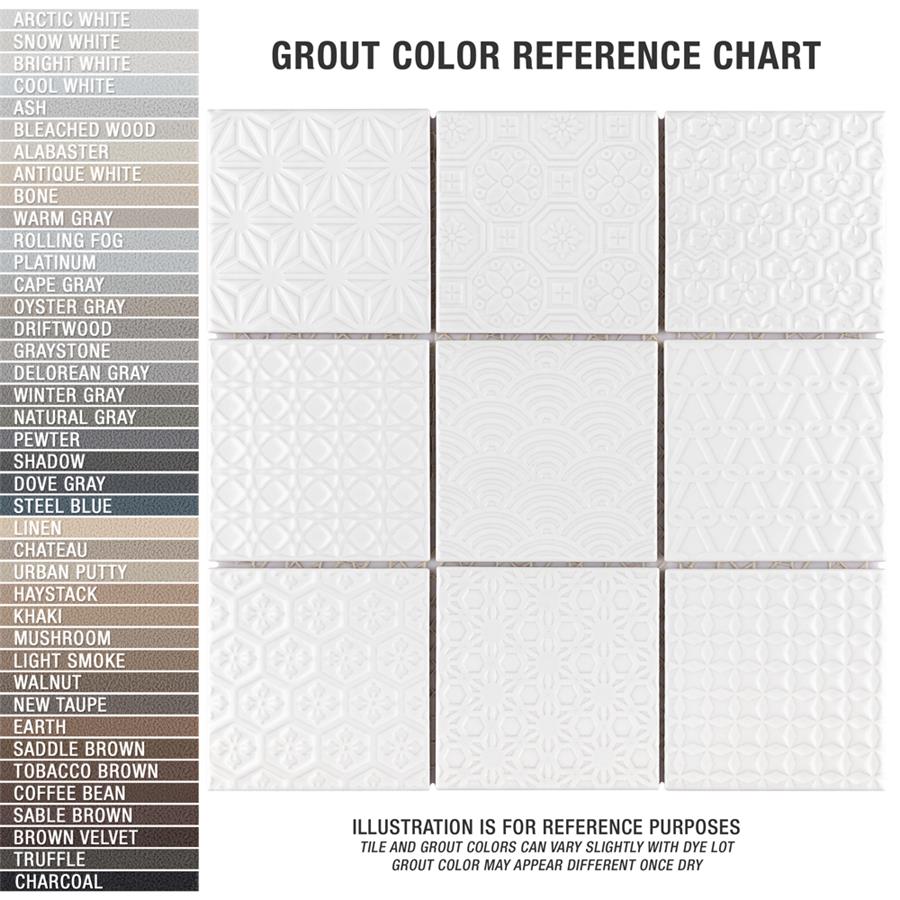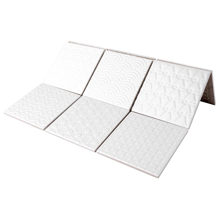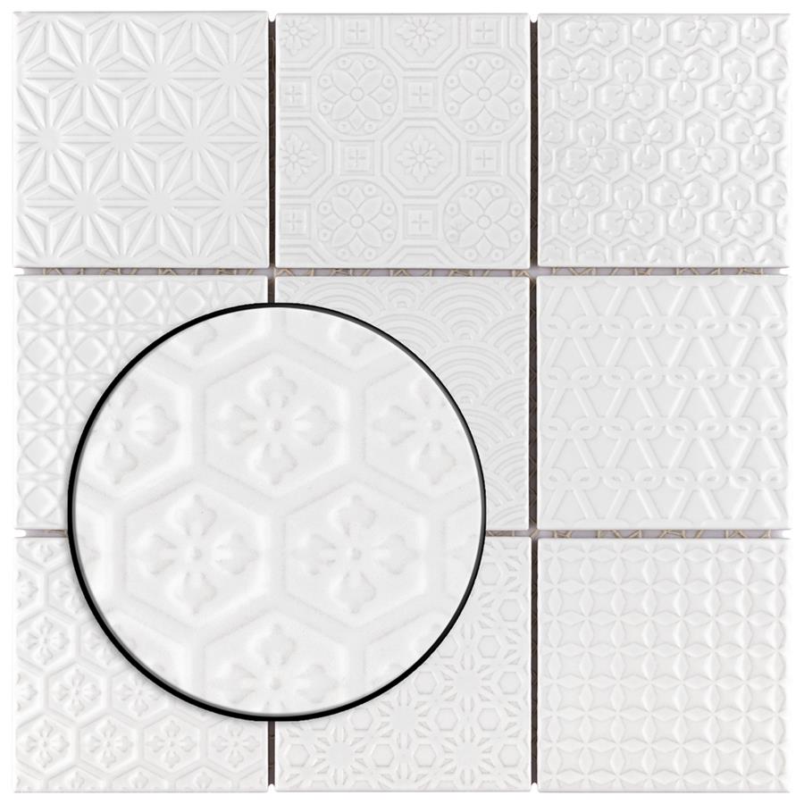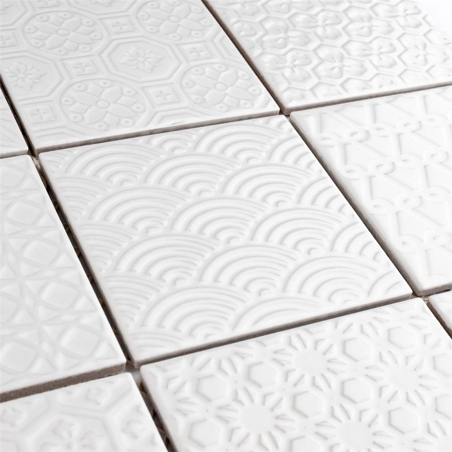 The SomerTile Spirit White 11-5/8 in. x 11-5/8 in. x 6 mm Porcelain Mosaic Tile blends together rustic elements and a contemporary feel. Each patchwork mosaic features nine tiles with a different design that varies throughout each sheet. These white tiles have raised patterns, giving a multi-dimensional look to any room. The strong mesh backing material makes for easy installation and the durable porcelain material and impervious water absorption rating make this mosaic a great choice for indoor and outdoor applications.