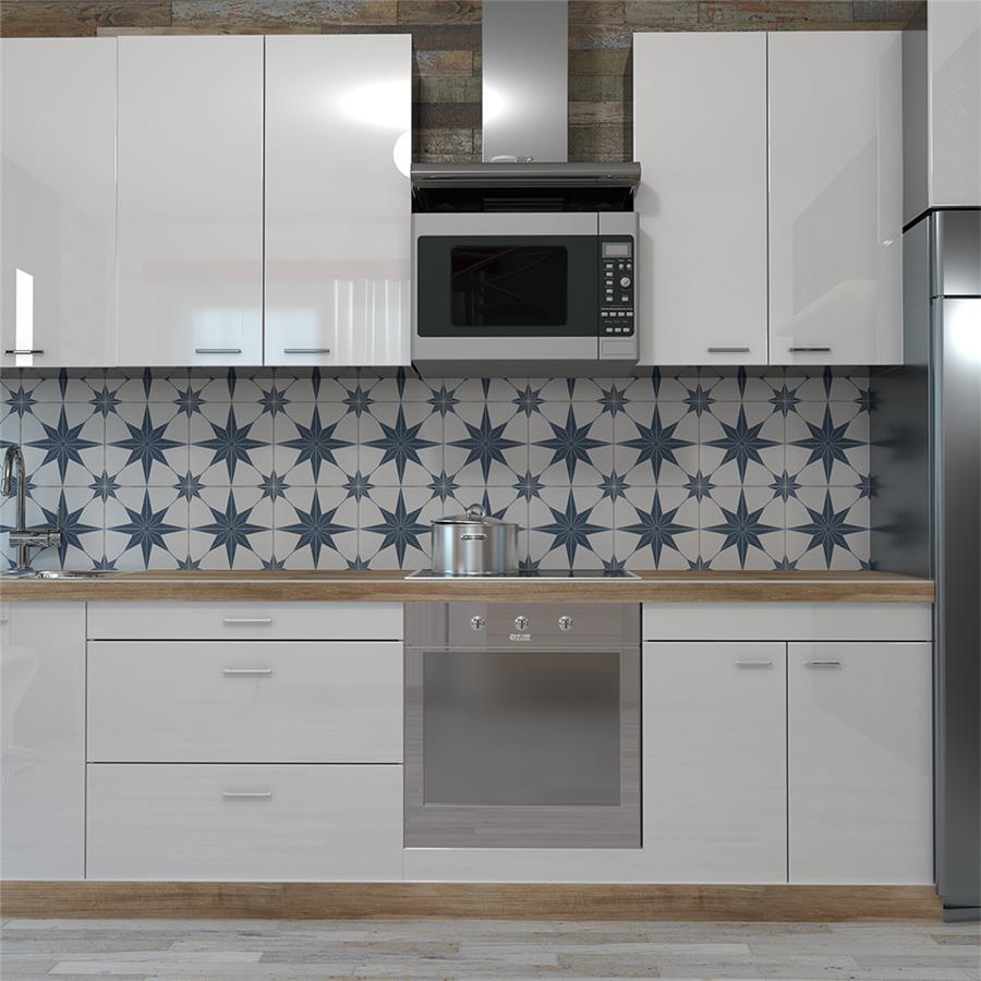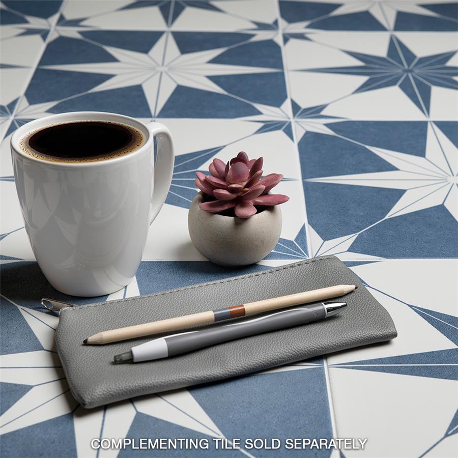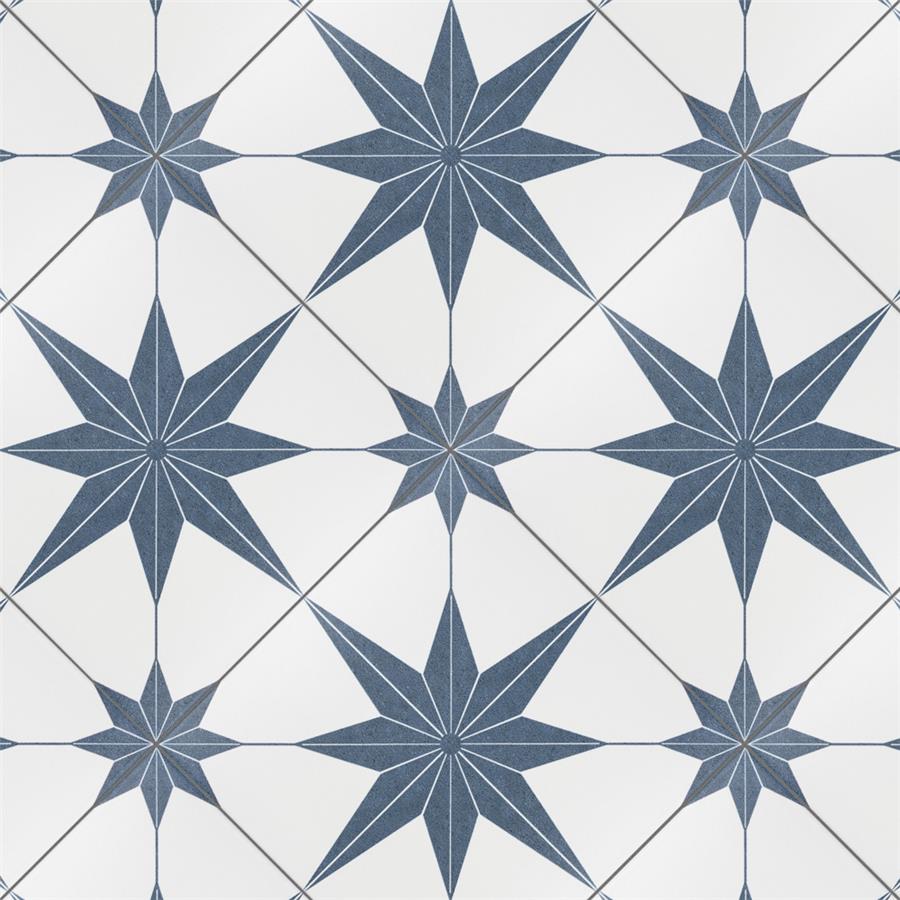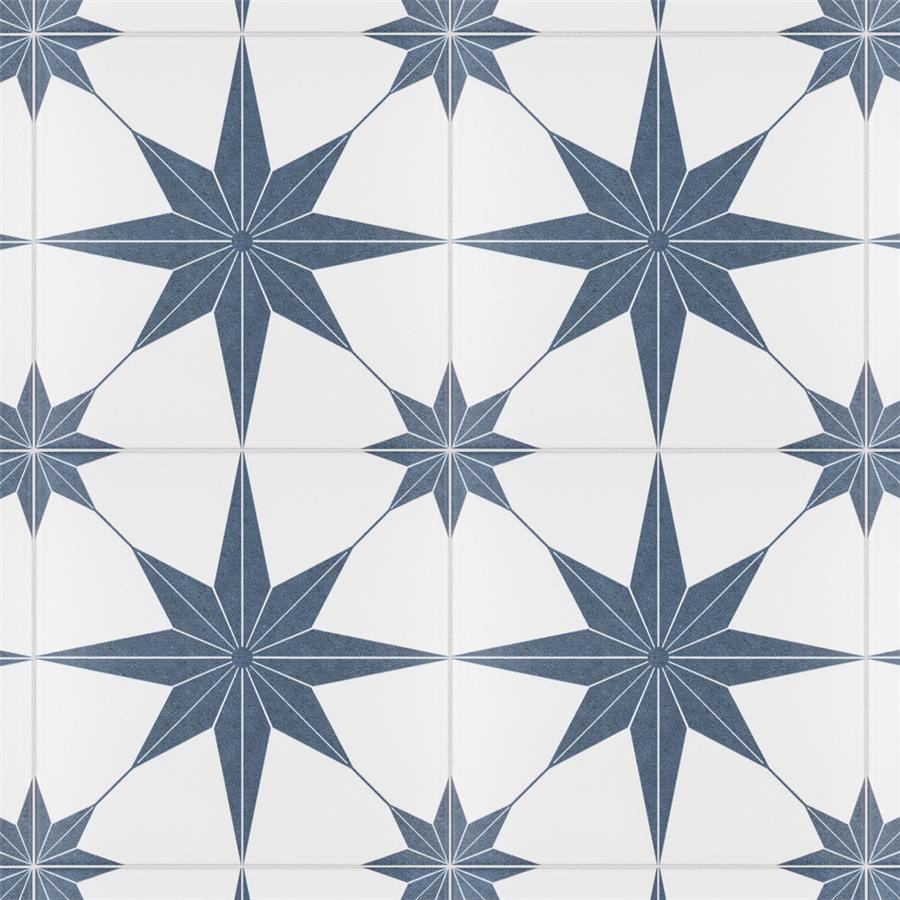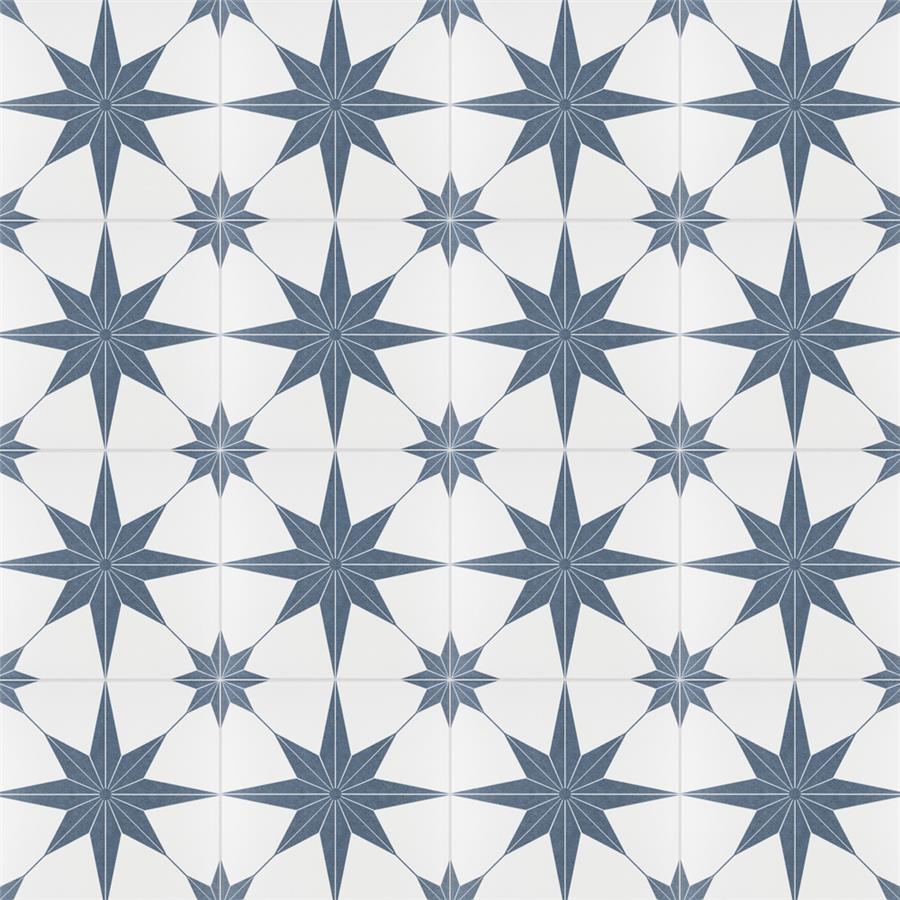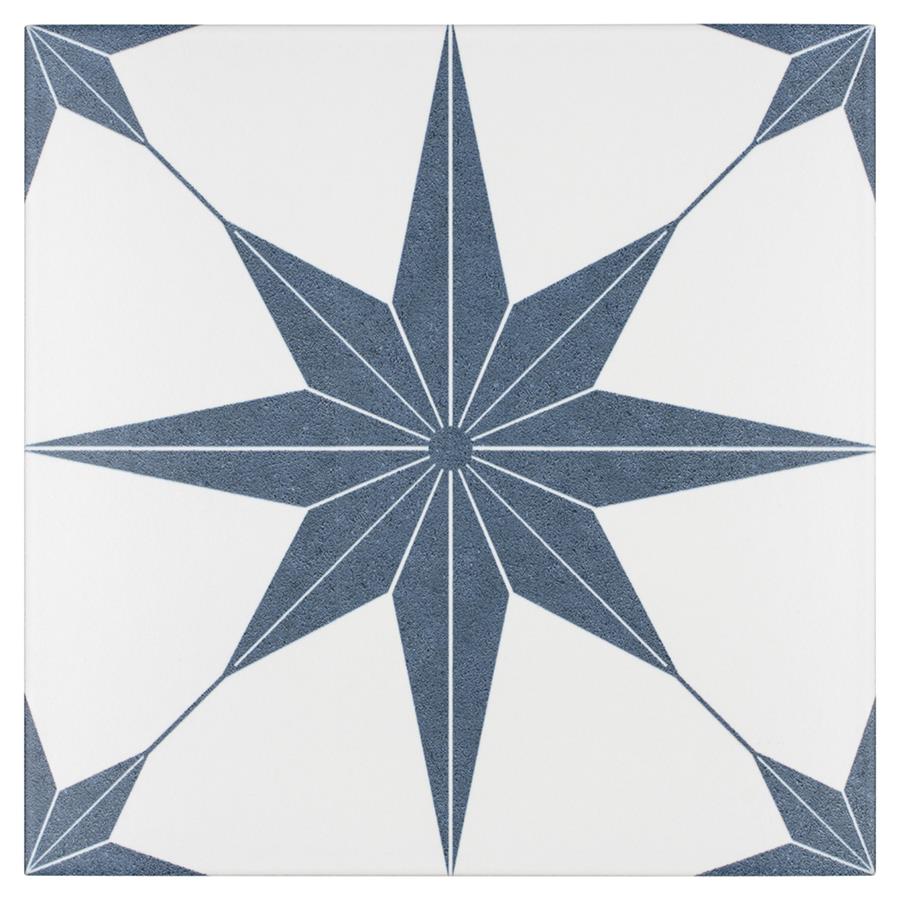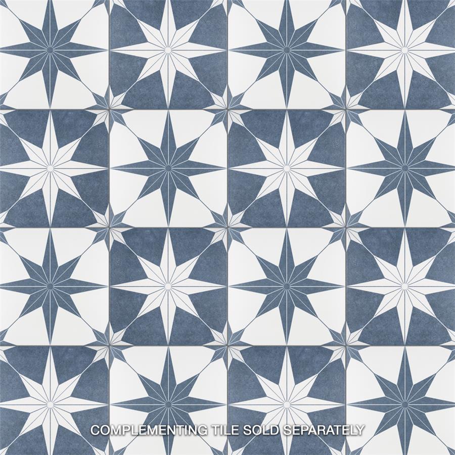 The SomerTile Stella Azul 9-3/4 in. x 9-3/4 in. Porcelain Floor and Wall Tile offers a modern twist to classic old-world European elegance. In bluish-grey and chalky white tones, this unique patterned tile features a star constructed of geometric shapes at its center. The medium-sheen glazed surface offers a sleek look that adds extra character to this unique artistic tile. Its impervious and frost resistant features make this an ideal tile for both indoor and outdoor use, including backsplashes, bathrooms, kitchens and patios.Tile is the better choice for your space. This tile is made from natural ingredients, making it a healthy choice as it is free from allergens, VOCs, formaldehyde and PVC.