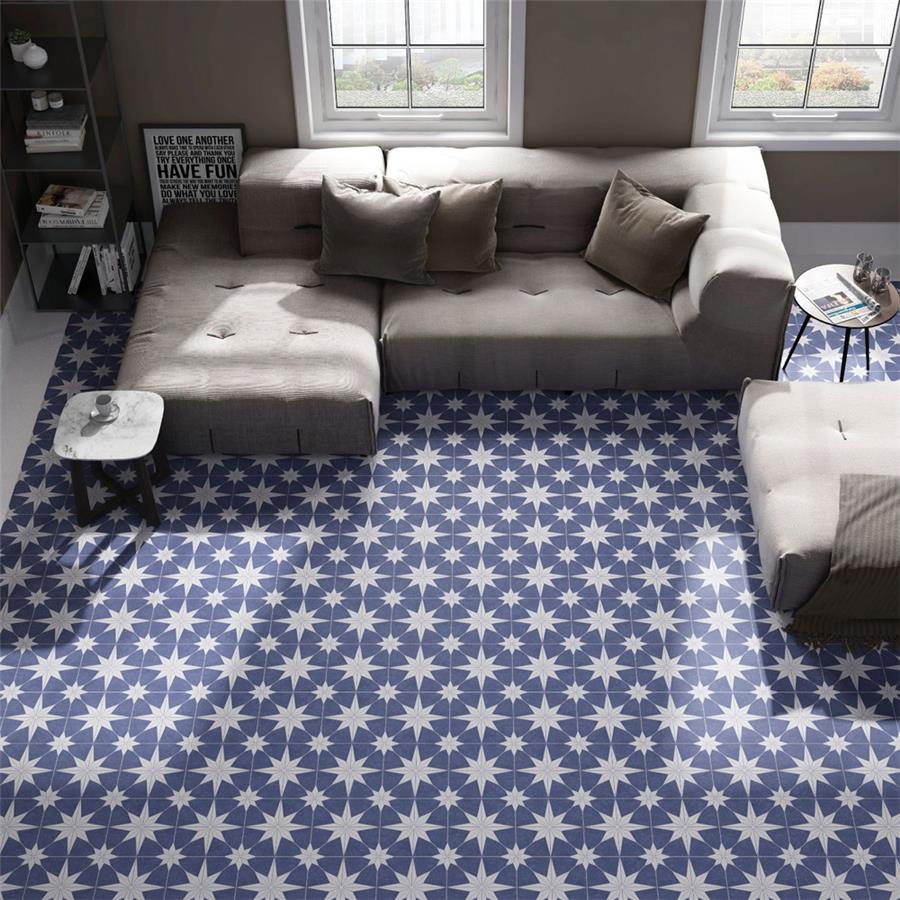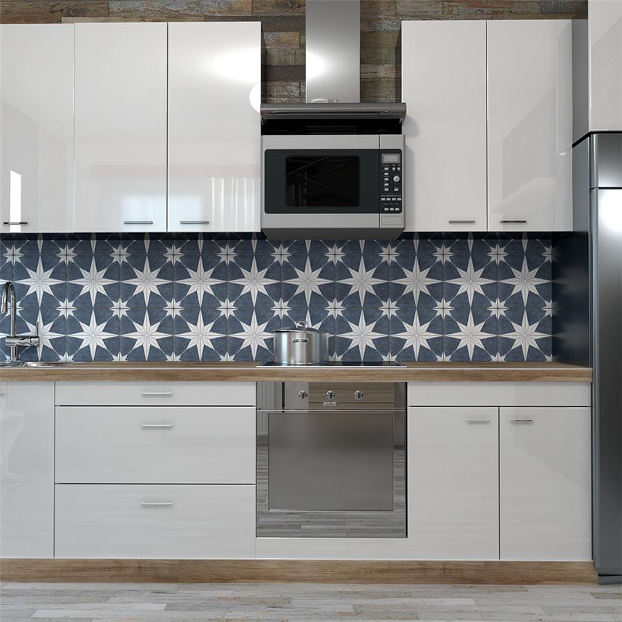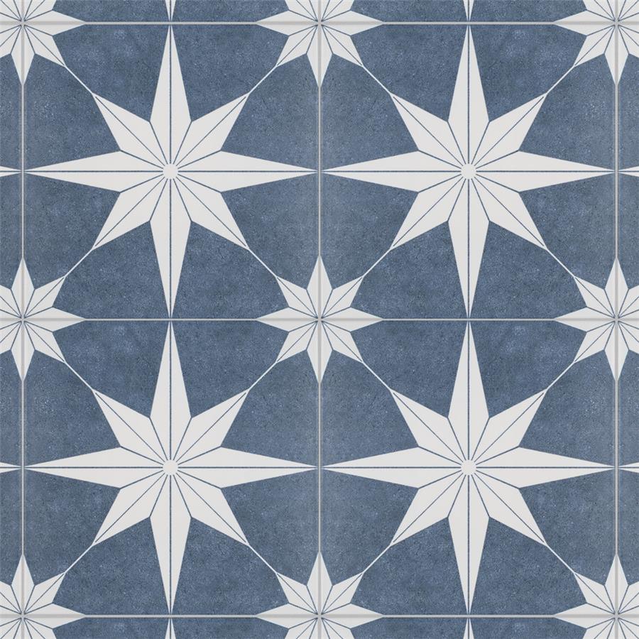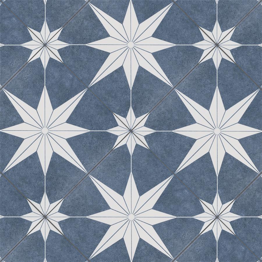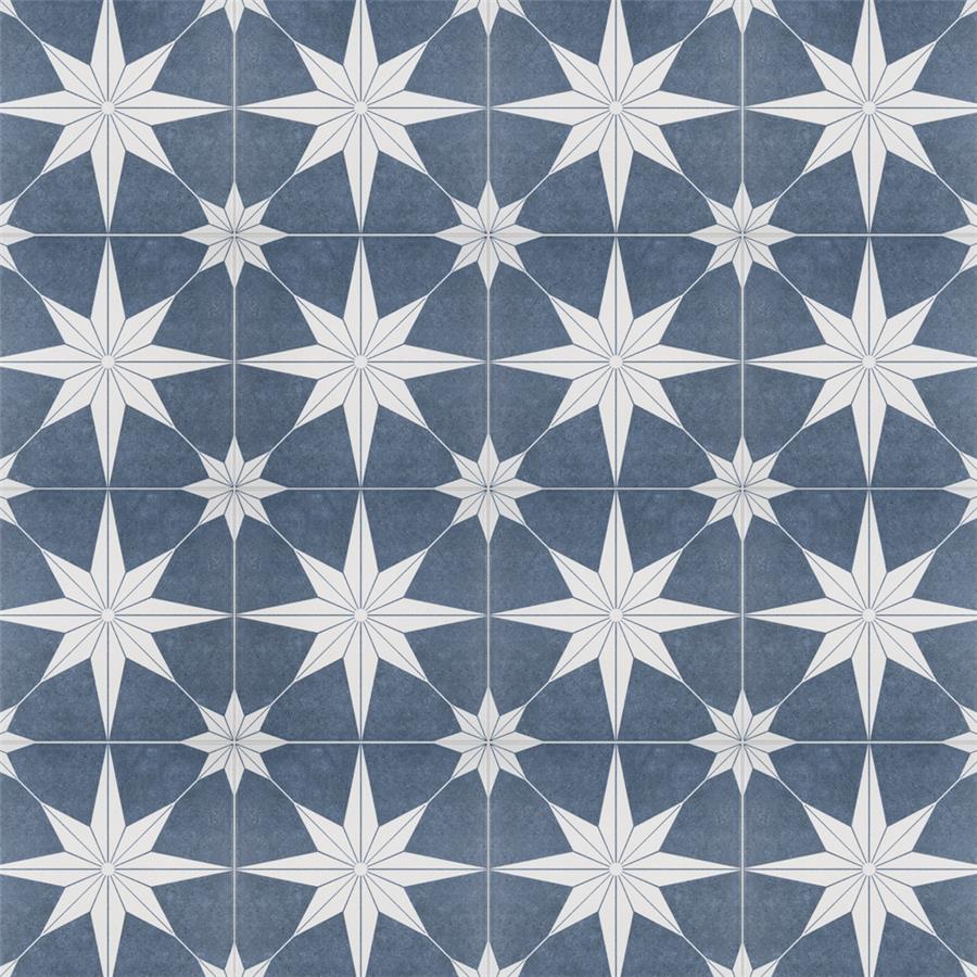 The SomerTile Stella Day 9-3/4 in. x 9-3/4 in. Porcelain Floor and Wall Tile offers a modern twist to classic old-world European elegance. In bluish-grey and chalky white tones, this unique patterned tile features a star constructed of geometric shapes at its center. The medium-sheen glazed surface offers a sleek look that adds extra character to this unique artistic tile. Its impervious and frost resistant features make this an ideal tile for both indoor and outdoor use, including backsplashes, bathrooms, kitchens and patios.Tile is the better choice for your space. This tile is made from natural ingredients, making it a healthy choice as it is free from allergens, VOCs, formaldehyde and PVC.