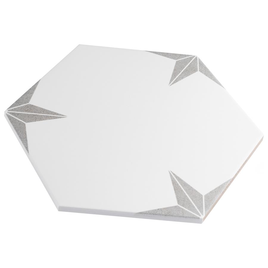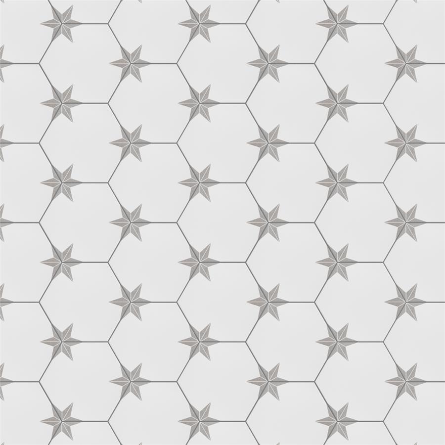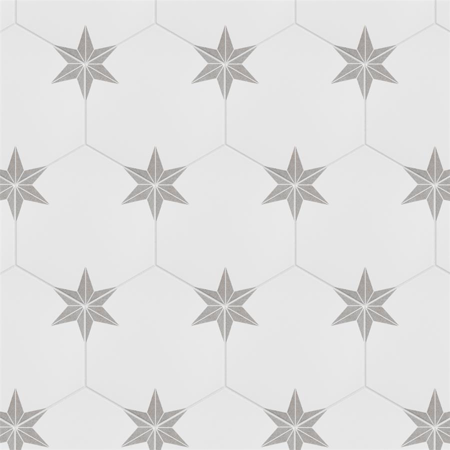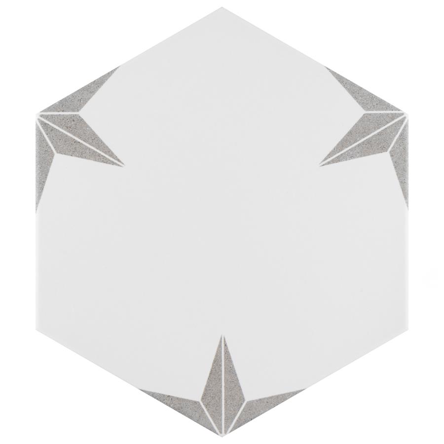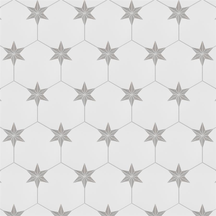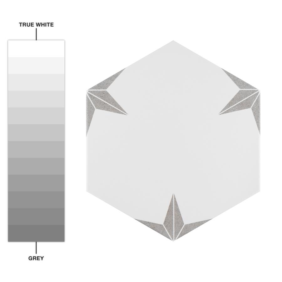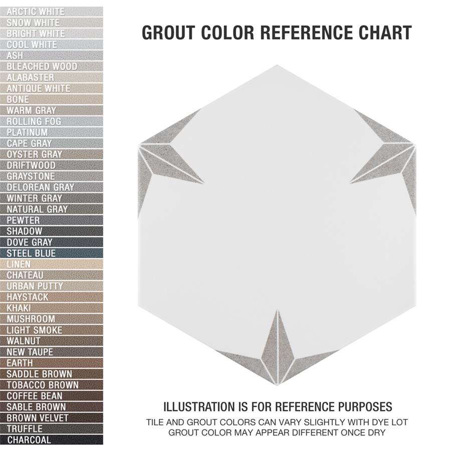 Our Stella Hex Silver 8-5/8″ x 9-7/8″ Porcelain Floor and Wall Tile transforms any space into a work of art through geometric patterns that when laid out, combine to create captivating star designs. This hexagon tile features a chalky white color tone accented by light grey triangular patterns along the edges. Its geometric shape is unique yet simple enough to integrate into any design, ranging from traditional style renovations to modern home projects. The smooth, satin glazed surface offers a sleek look that adds extra character to this floor and wall tile. Its impervious, frost resistant, and durable features make it an ideal choice for both commercial and residential indoor and outdoor installations including, kitchens, bathrooms, backsplashes, showers, hallways, entryways, patios, and fireplace facades. This tile is a perfect choice on its own or coordinated with other products in the Stella Hex series. Tile is the better choice for your space. This tile is made from natural ingredients, making it a healthy choice as it is free from allergens, VOCs, formaldehyde, and PVC.Try out our grout test below to determine which grout color suits your design preferences.