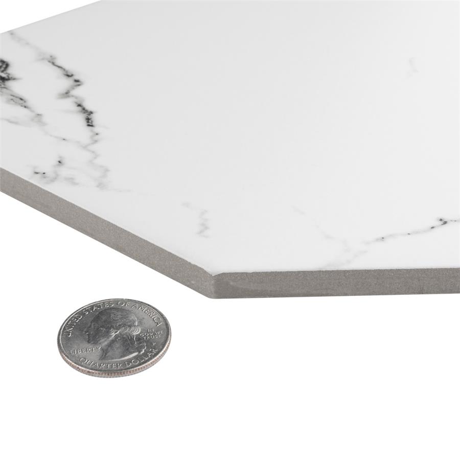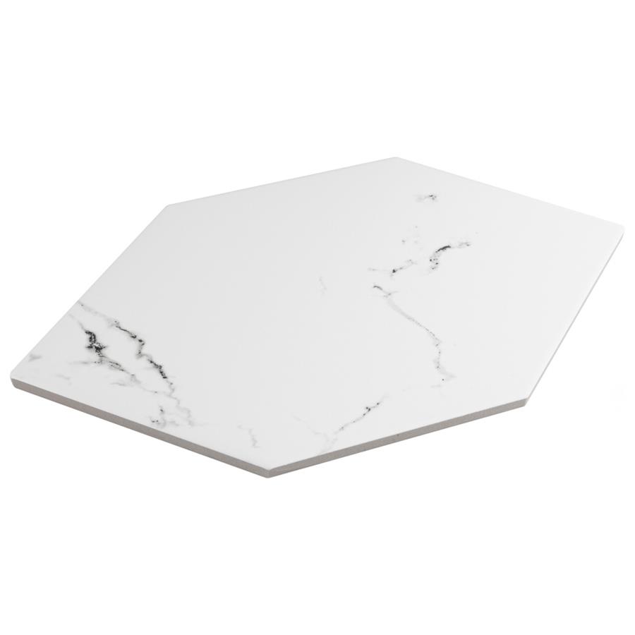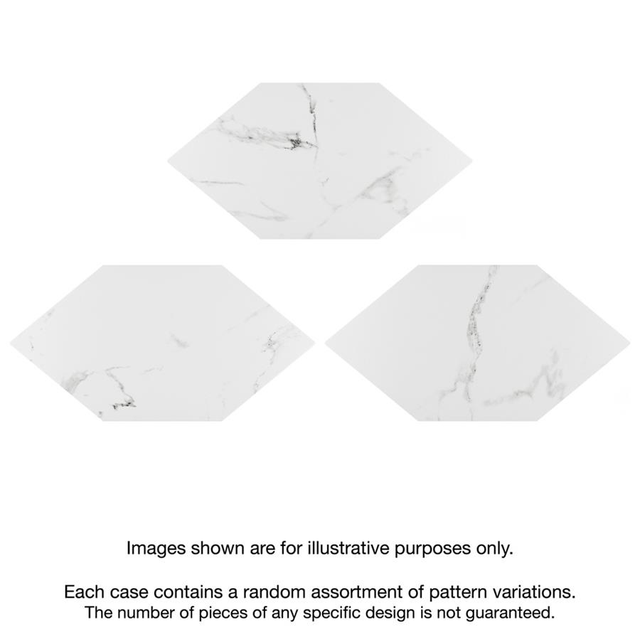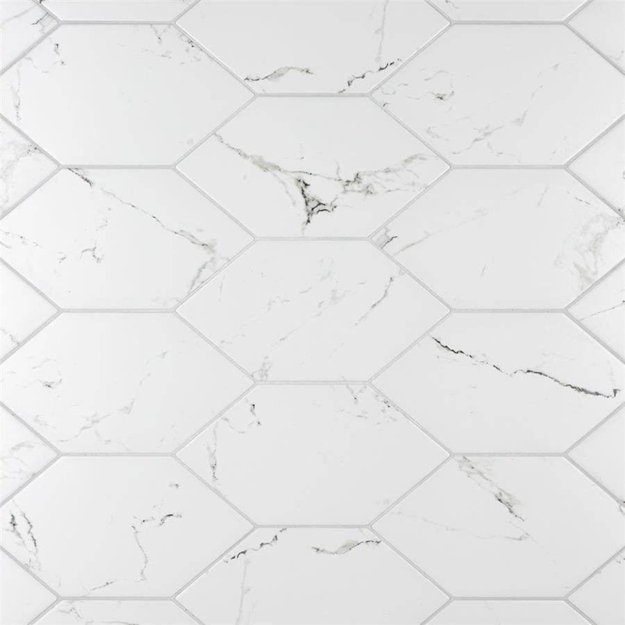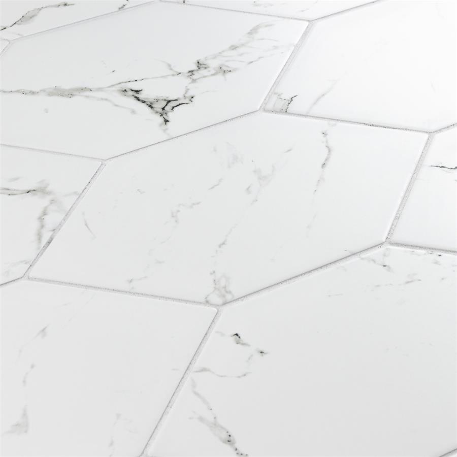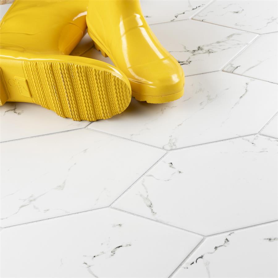 Emulating the timeless beauty of marble in a reimagined geometric format, our Timeless Calacatta Kayak 7″ x 13″ Porcelain Floor and Wall Tile provides playful visual appeal for any space. This marble-look tile offers a fresh approach to the classic hexagon silhouette with its unique elongated shape. Set on a smooth, matte white base glaze, this tile is complemented with light and dark grey veining striations that sporadically flow throughout the design for added authenticity. This trendsetting display of sophisticated geometric design is visually appealing and versatile, and blends beautifully with a range of styles from traditional to modern day. Available in 37 different print variations that are randomly distributed throughout each case, this tile offers a one-of-a-kind look. Its impervious, frost-resistant and durable features make it an ideal choice for both commercial and residential indoor and outdoor installations including kitchens, bathrooms, backsplashes, showers, entryways and patios. Tile is the better choice for your space. This tile is made from natural ingredients, making it a healthy choice as it is free from allergens, VOCs, formaldehyde and PVC.Try out our grout test below to determine which grout color suits your design preferences.