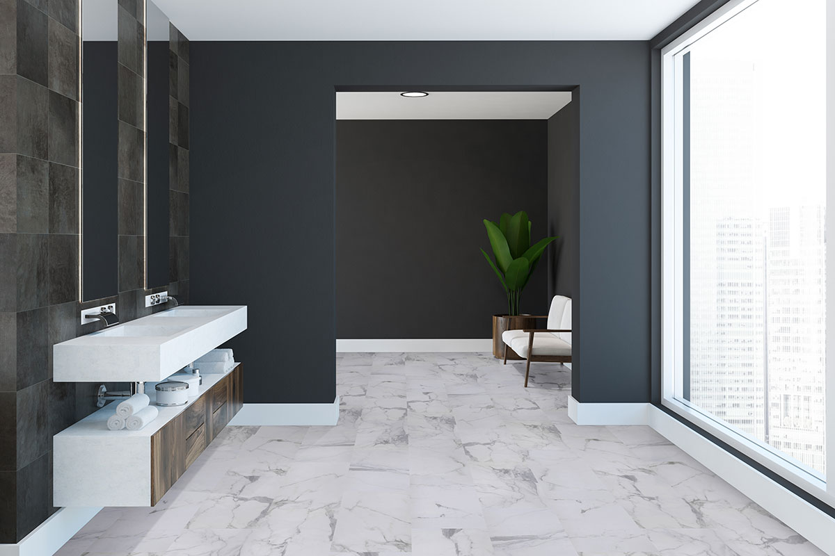 A bright white background and heavy smoky gray veining meld beautifully in Calacatta Legend™ Luxury Vinyl Tile. This waterproof vinyl flooring offers the look of natural stone that is always sophisticated and always on-trend. The flooring is 100% waterproof, scratch, stain, and dent resistant. An innovative 1MM pre-attached backing offers sound protection and comfort underfoot. Calacatta Legend™ is coated with PietraTech™ – an MSI exclusive polish that emulates smooth polished marble. In addition, it features a patented locking system for ease of installation. The tile is available in 12″ x24″ and 18″ x36″ sizes for added design flexibility. Add some glamour to the bedroom, bathroom, kitchen, hallway, living room, and beyond.Flooring Info:Residential: YesCommercial: YesSee technical specifications sheets for application details
