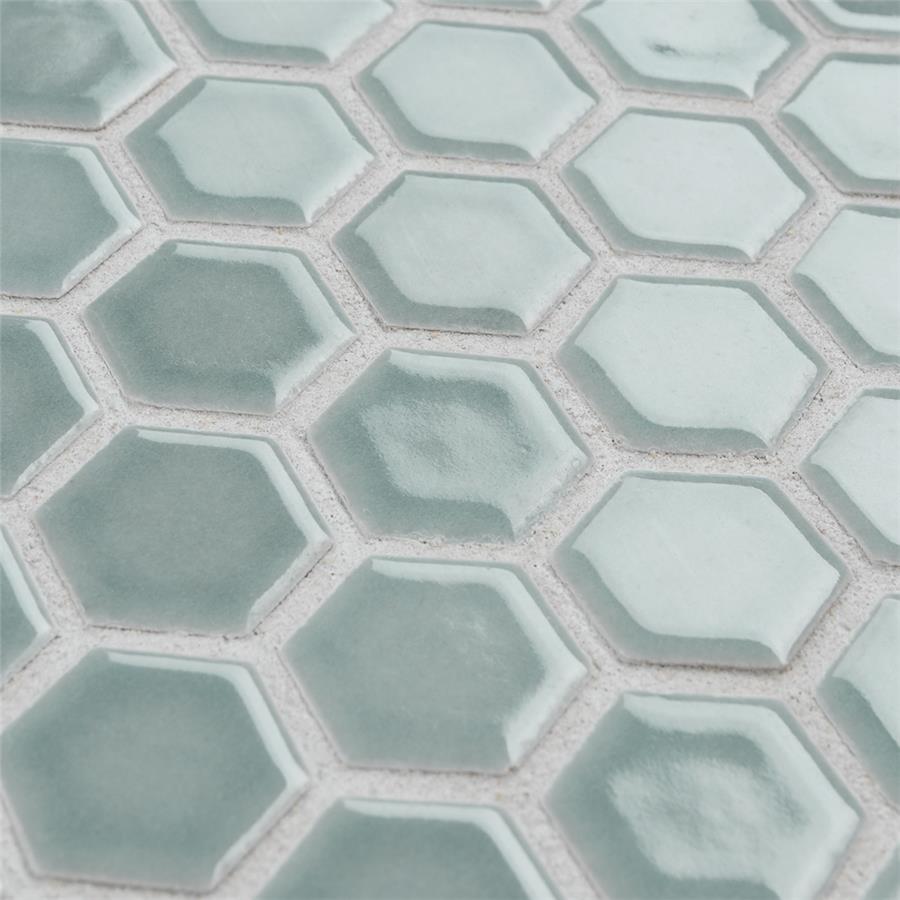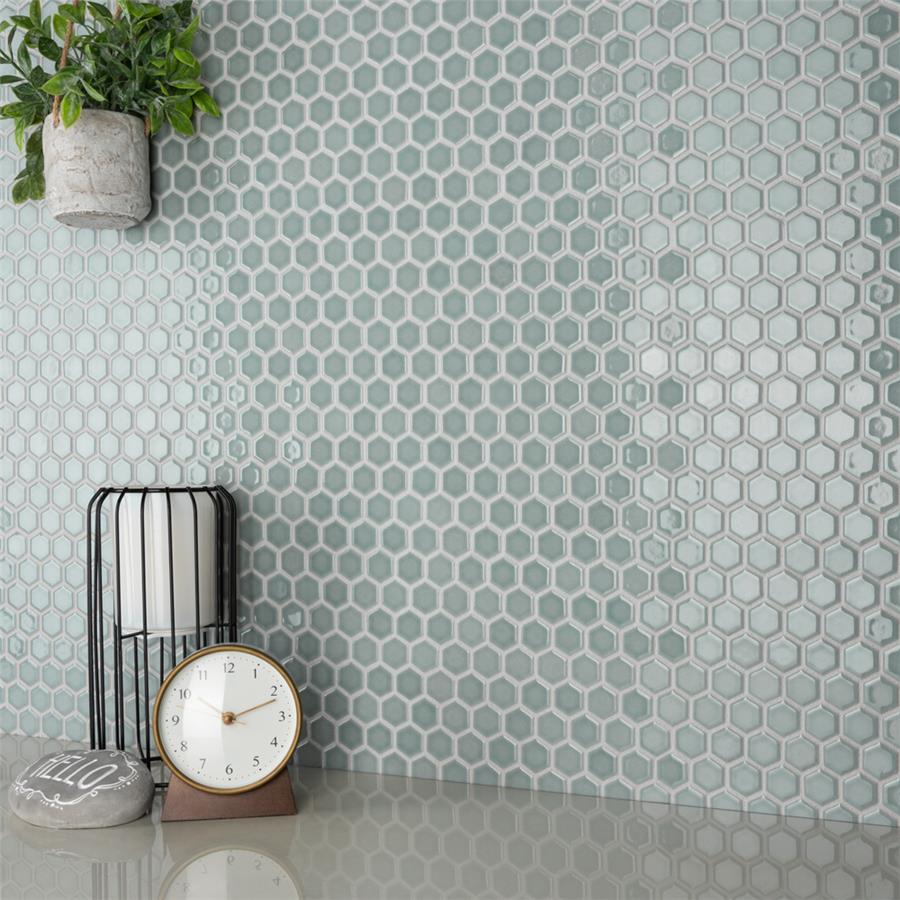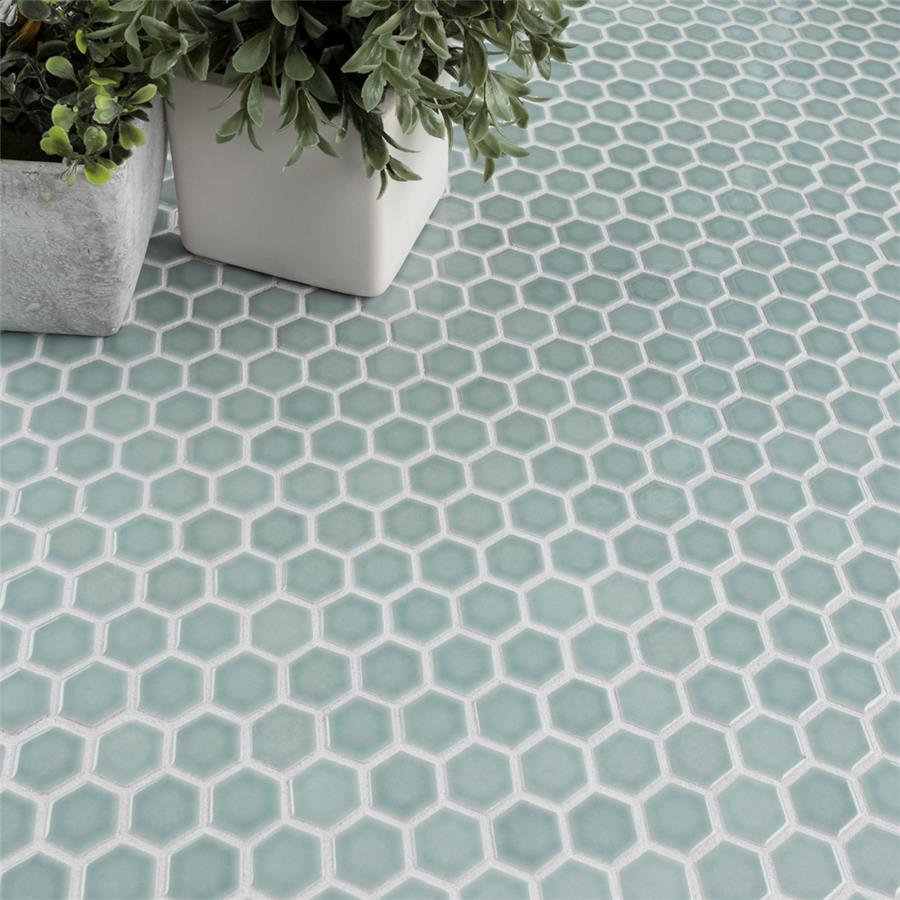 Lending a unique touch of color, our Tribeca Hex 1” Glossy Mist 10-1/4″ x 11-7/8″ Porcelain Mosaic Floor and Wall Tile instantly elevates spaces through a refreshing dose of vivid geometric design. Featuring a reactive glaze with an eye-drop effect, these tiles have a light grey color tone that blend to white around the edges. This mosaic is a pleasing mixture of cool-toned tints with additional dimension added by the smooth, high-gloss finish. Small hexagons are arranged on an interlocking mesh to create a seamless installation. This minimalistic geometric porcelain mosaic is unique yet simplistic enough to integrate into any design, ranging from traditional style renovations to modern home projects. Its impervious and frost-resistant features make this an ideal tile for both indoor and outdoor residential use, including backsplashes, bathrooms, showers and kitchens. This tile is a perfect choice on its own or paired with other products in the Tribeca Hex Mosaic Collection.Tile is the better choice for your space. This tile is made from natural ingredients, making it a healthy choice as it is free from allergens, VOCs, formaldehyde and PVC.