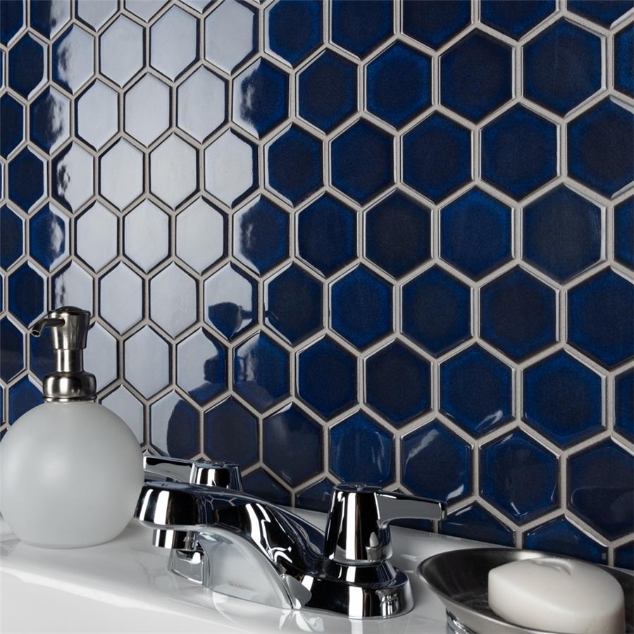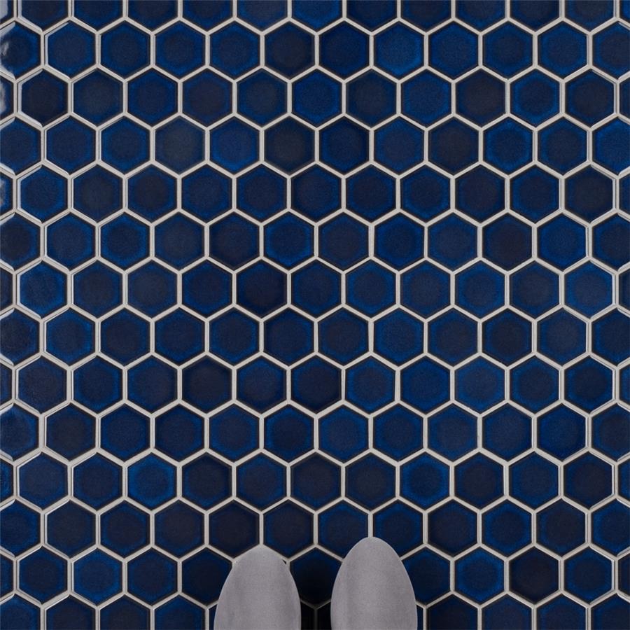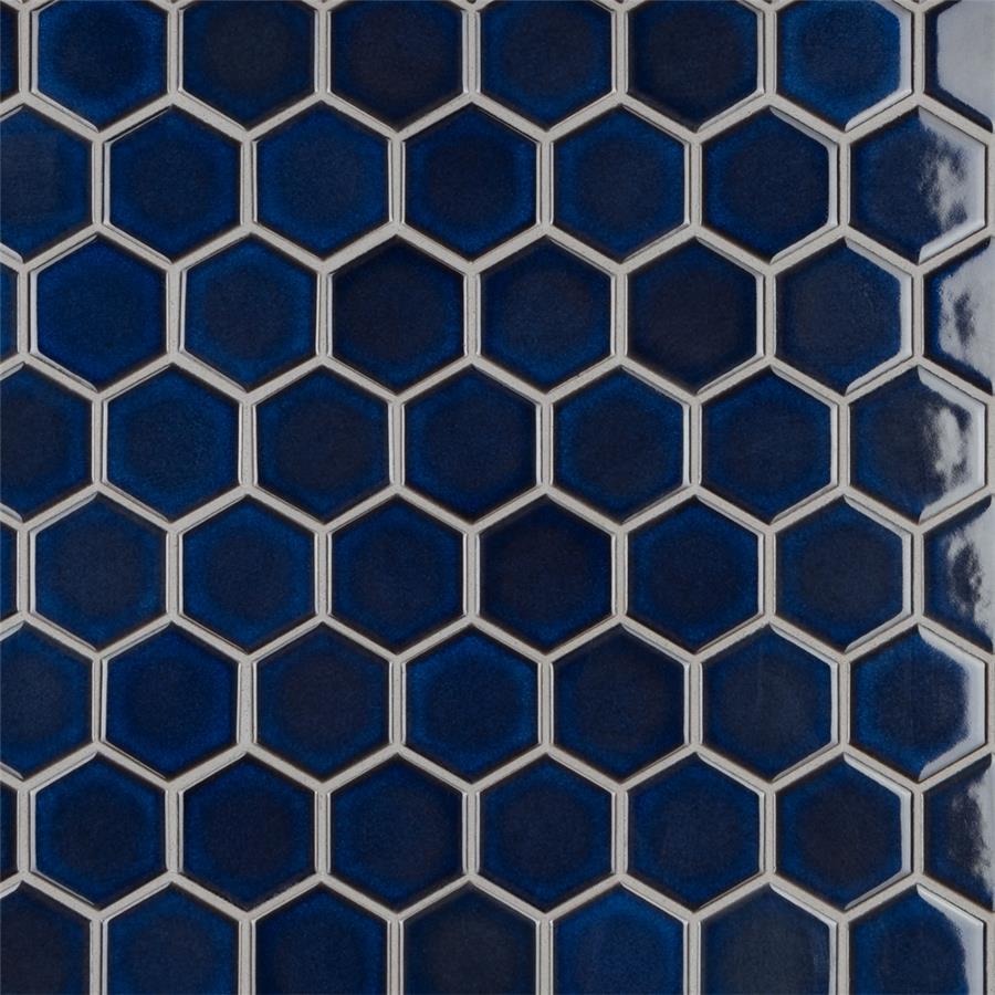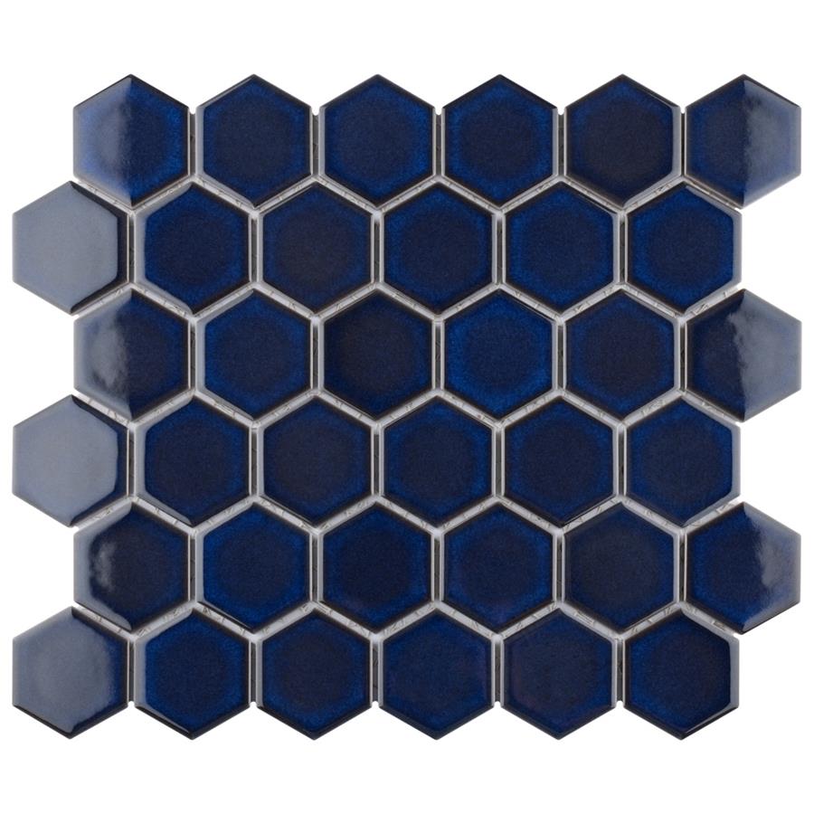 Our Tribeca Hex2″ Glossy Cobalt 12-5/8” x 11-1/8” Porcelain Floor and Wall Mosaic Tile instantly elevates spaces through a refreshing dose of geometric design. With subtle variations in color tone that gradually fade to black around the border, each piece is truly unique. Its rich reactive glaze echoes dark to deep midnight blue hues with a high-gloss finish that is unique yet simplistic enough to integrate into any design, ranging from traditional style renovations to modern home projects. Its impervious and frost-resistant features make this an ideal tile for both indoor and outdoor residential use, including backsplashes, bathrooms, showers and kitchens. This tile is a perfect choice on its own or paired with other products in the Tribeca Hex Mosaic Collection.Tile is the better choice for your space. This tile is made from natural ingredients, making it a healthy choice as it is free from allergens, VOCs, formaldehyde and PVC.