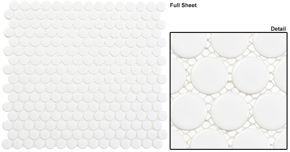 Tile Size: 3/4″ Penny RoundSheet Size: 11 3/8″ x 12 15/16″Sheet Coverage: .97 SQFRows Per Sheet: 16Tiles Per Sheet: 240Cut into Borders: Every 2 rowsTile Thickness: 3/16″ (5mm)Grout Joint: 1/16″ (2mm)Mesh Mounted: YesDue to the variance in installation methods, grout colors, lighting, image variances and computer monitor settings; the images above may not accurately represent the true color of the products after installation.Therefore Glazzio Tiles always recommends that tiles not be purchased from an image of any kind.