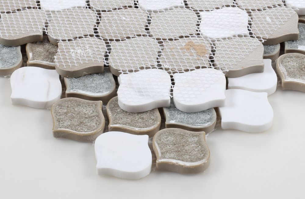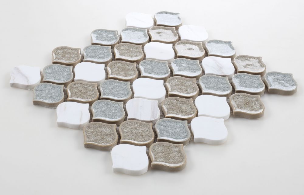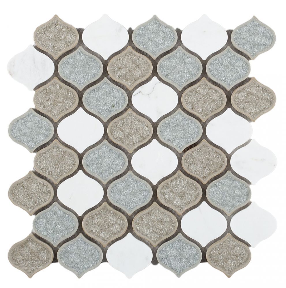 Product Sold By The SheetVan Gogh Sky – 2×2″ arabesque shape white carrara marble mixed with grey and blue crackle glass mosaic.Must seal the glass and stone for the shower wall installation.Suggested Grout Color: Bostik Dimension Diamond H600WARNING: This product can expose you to chemicals including crystalline silica (airborne particles of respirable size) in dust created during fabrication/installation if the product is dry cut/ground or pulverized, which are known to the State of California to cause cancer. For more information, go to https://www.p65warnings.ca.gov/.