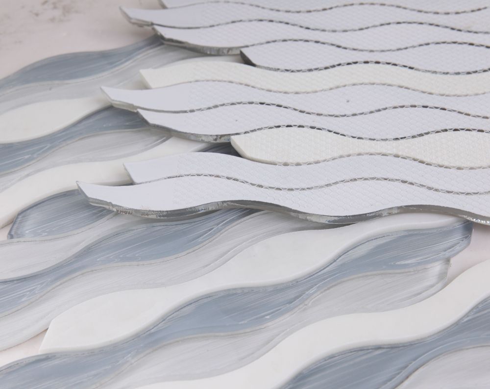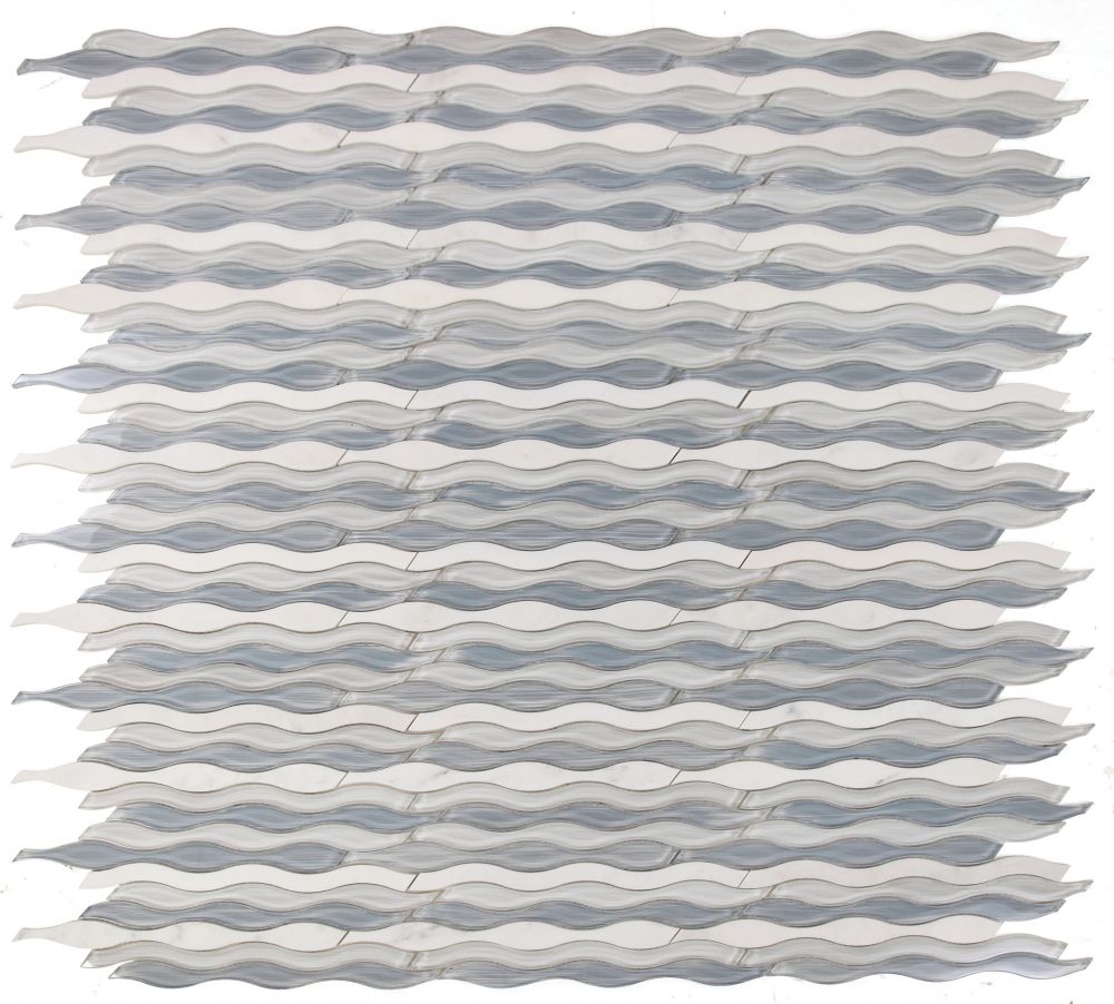 Product Sold By The SheetWater Carrara Goose: Water Jet Mosaic. White, Grey glass and Carrara marble in water wave shape.Glass tile thin-set required recommend: Custom Building Products White Premium Glass Tile Thin-Set Mortar.Suggested Grout Color: Bostik Dimension Diamond H600WARNING: This product can expose you to chemicals including crystalline silica (airborne particles of respirable size) in dust created during fabrication/installation if the product is dry cut/ground or pulverized, which are known to the State of California to cause cancer. For more information, go to https://www.p65warnings.ca.gov/.
